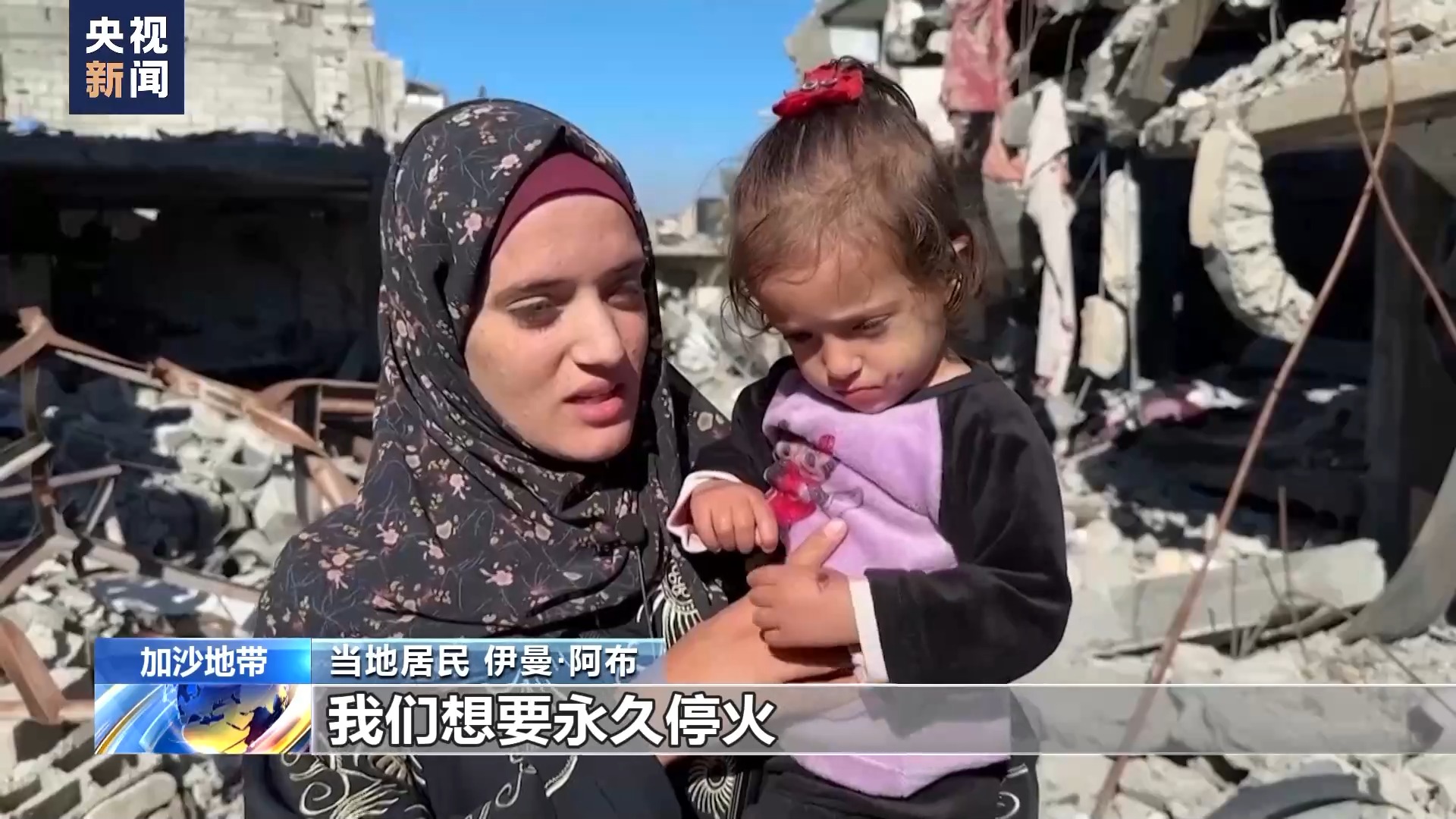 当地居民 伊曼·阿布:回到家里更加触痛了我们的心,我们不想要一两天的暂时停火,我们想要永久停火。因为我们和孩子们都累了,我们已经流离失所。我们把几个孩子留在避难所,返回这里从废墟下给孩子们找些衣服,我们需要永久停火。