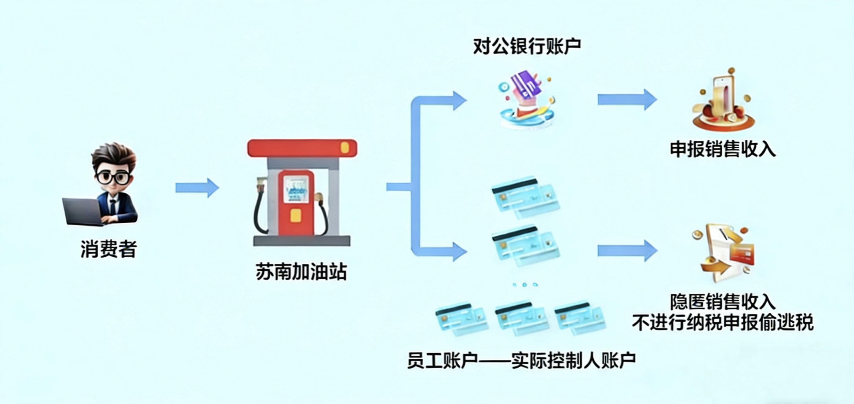 至此,该加油站账外经营的违法事实浮出水面:加油站对公账户仅入账开票收入与零星现金收入,用于应付日常纳税申报,营造合规经营的假象,而大量个人消费者支付的油款,则通过绑定员工私人账户的二维码收取,三年间累计隐匿不含税销售收入1593.52万元。