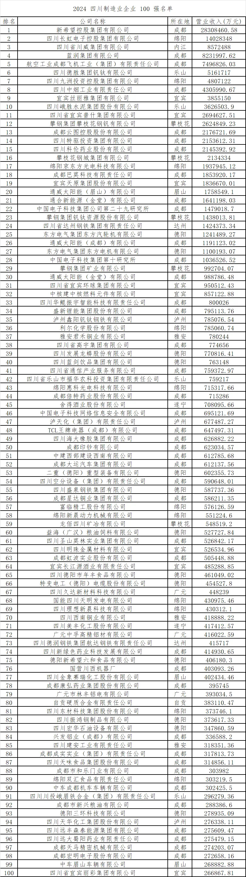 其中,营业收入500亿以上企业17家,航空工业成都飞机工业(集团)有限责任公司、攀钢集团有限公司、四川德胜集团钒钛有限公司为新进500亿的企业。