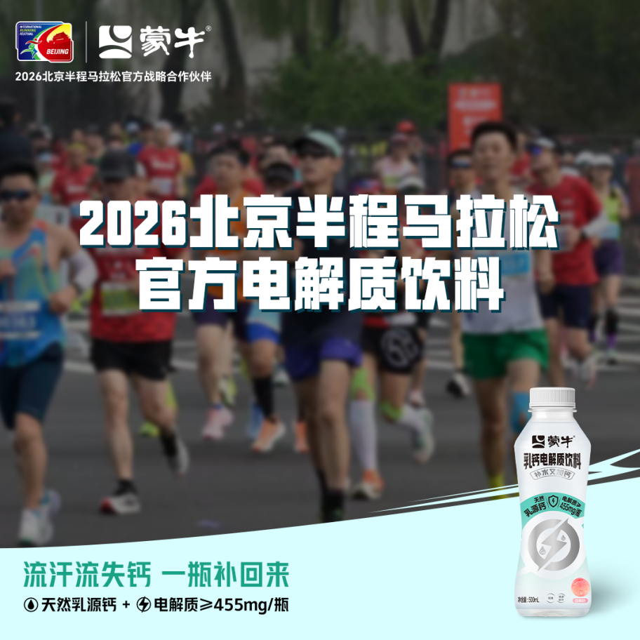 更重要的是,蒙牛通过高频、长期的马拉松赛事合作,深度洞察消费风向和需求,敏锐捕捉到了“运动补钙”这一细分需求的价值:运动大量流汗会导致钙质流失,增加抽筋风险,也影响赛后恢复。但放眼整个运动饮料货架,几乎没有产品能解决这个痛点。于是,蒙牛迅速在2026年初推出乳钙电解质饮料,填补了天然乳源钙在运动饮料市场的空白。
