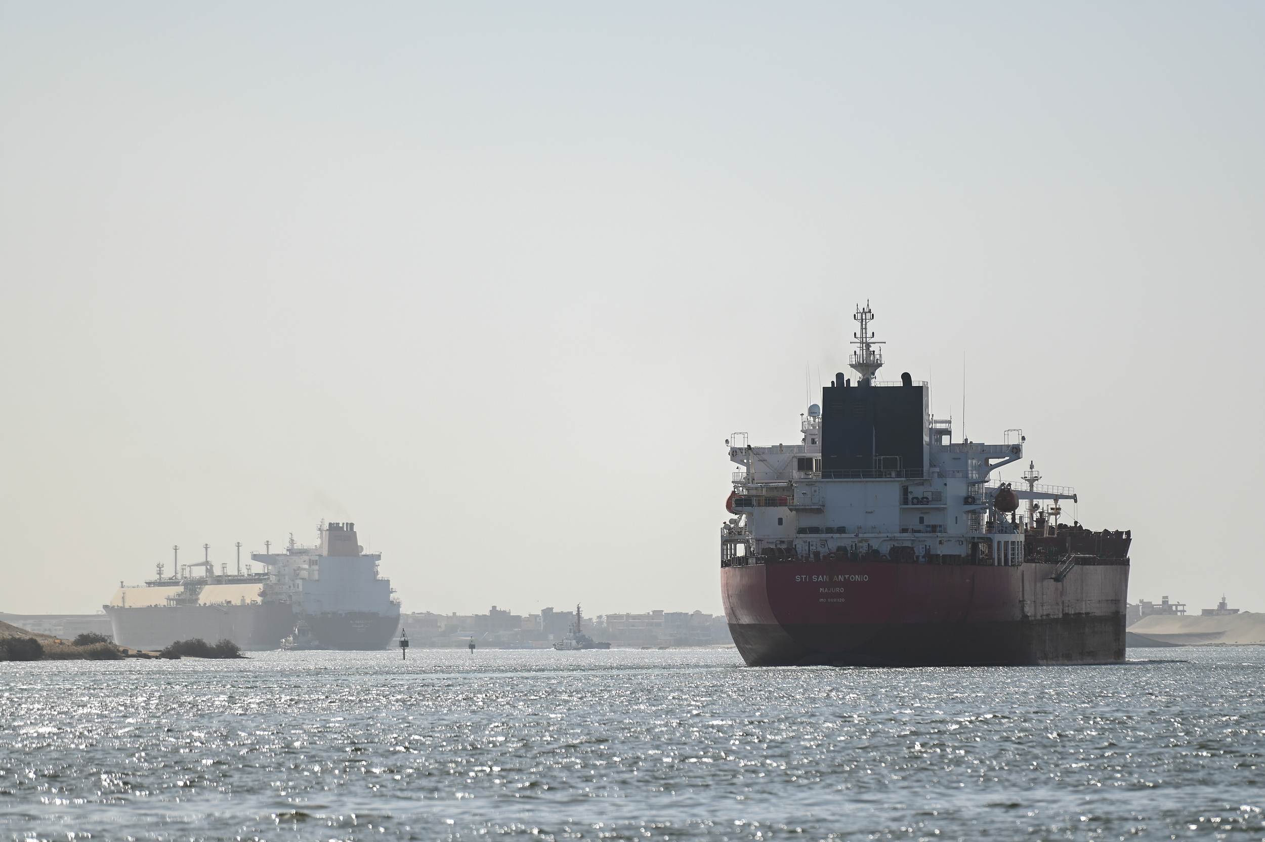 当地时间2024年1月10日,埃及伊斯梅利亚,一艘船通过苏伊士运河驶向红海。视觉中国 图