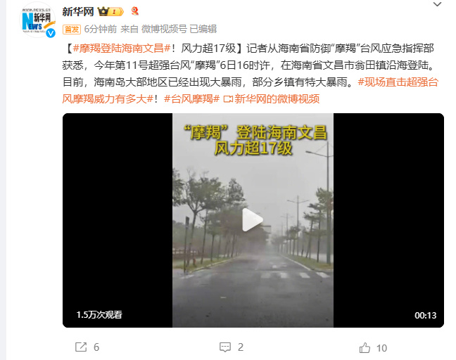 据新华网消息,记者从海南省防御“摩羯”台风应急指挥部获悉,今年第11号超强台风“摩羯”6日16时许,在海南省文昌市翁田镇沿海登陆。目前,海南岛大部地区已经出现大暴雨,部分乡镇有特大暴雨。