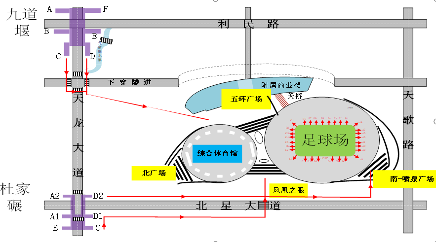观赛结束后乘车流程:预计赛事结束后杜家碾站D2口客流较大,从凤凰之眼或喷泉广场离场乘坐地铁的乘客建议按照工作人员指引选择杜家碾A2口、C口、D1口进站乘车;从五环广场离场搭乘地铁的乘客,可以选择从九道堰站进站乘车,步行进站约8分钟,其中请前往回龙方向的乘客从九道堰C口进站,前往华桂路方向的乘客从九道堰D口进站。
