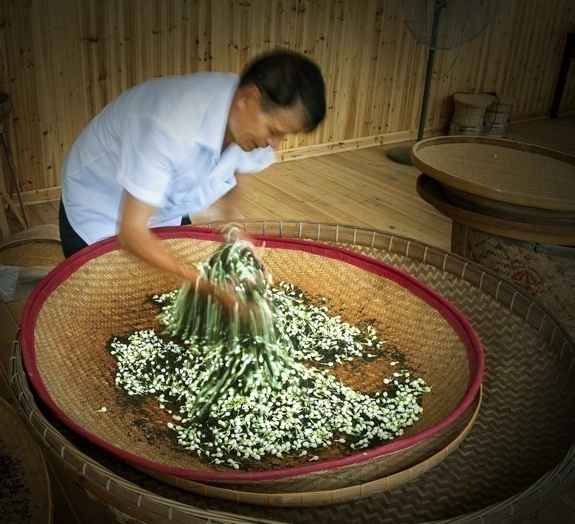 福州茉莉花茶窨制工艺是用特种工艺造型茶或经过精制后的绿茶茶坯与茉莉鲜花窨制花茶的传统工艺。福州茉莉花茶窨制过程主要是鲜花吐香和茶坯吸香的过程。