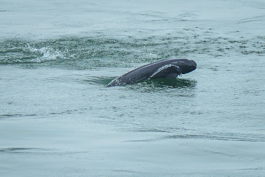 长江江豚在湖北省宜昌市葛洲坝下游水域逐浪嬉戏(2024年5月21日摄)。新华社记者 肖艺九 摄