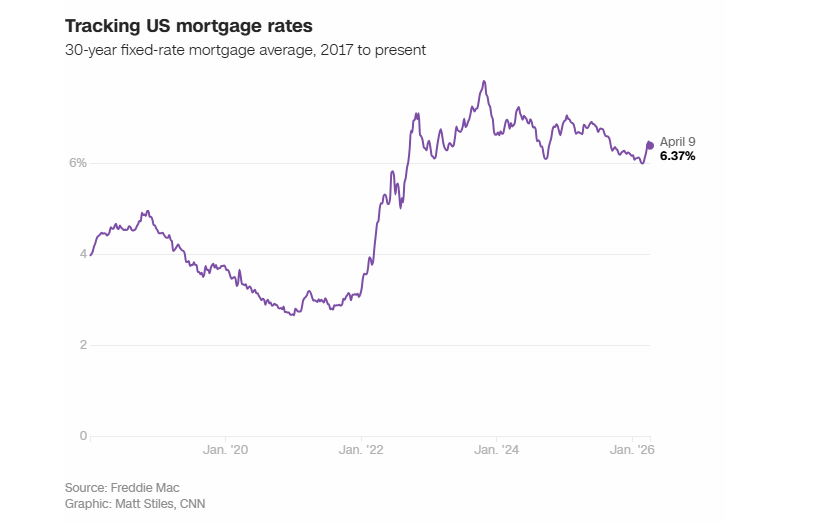 根据美国住房金融机构房地美(Freddie Mac)的数据,战争开始以来,美国抵押贷款利率连续五周攀升,本周才有所回落,30 年期固定抵押贷款的平均利率小幅下降至 6.37%。