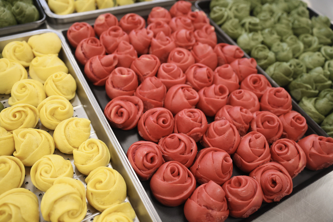 这些娇艳的“玫瑰”,并非鲜花,而是宁大餐饮服务中心特制的可食用馒头花。