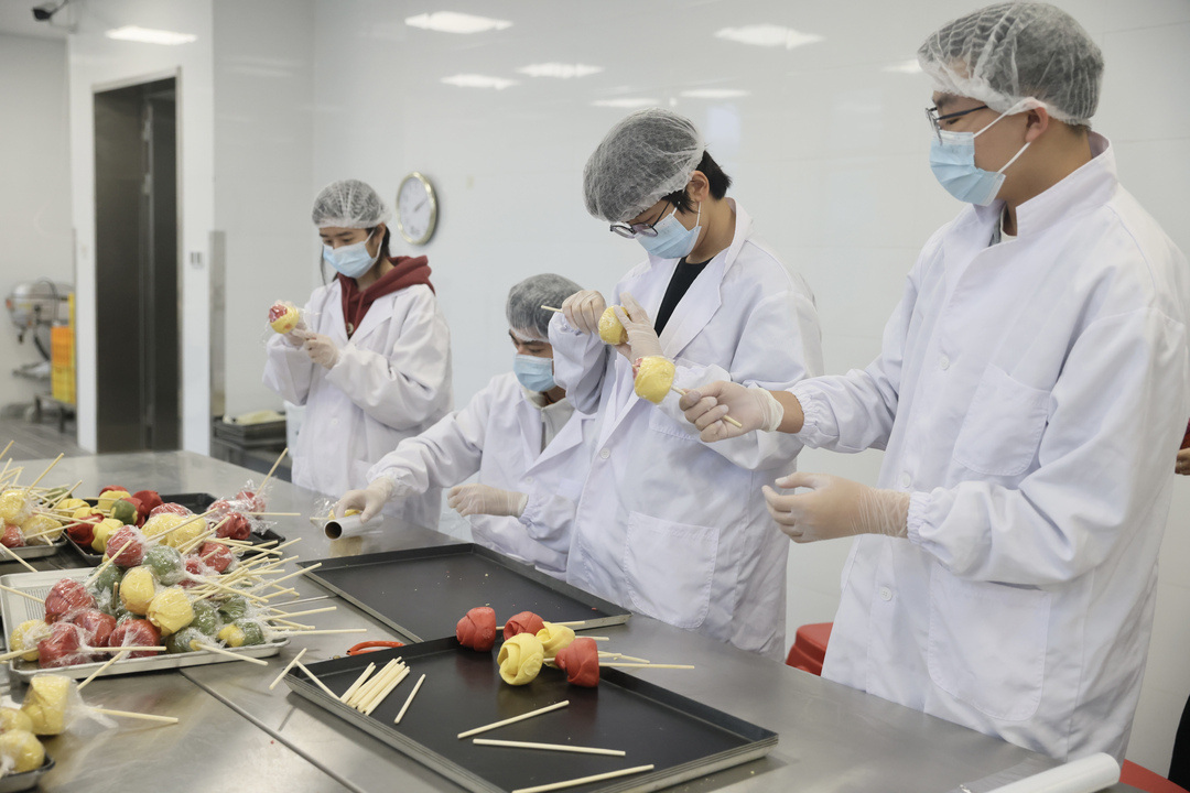 前一天,宁大后厨热气腾腾、面香四溢。红色的甜菜汁、金黄的南瓜泥、翠绿的茼蒿汁被揉进面粉里,面点师傅们指尖翻飞,揉面、擀皮、塑形,手腕轻轻一转,一朵朵栩栩如生的“馒头花”便在掌心绽放。学生志愿者则负责包装成束,粘贴祝福标签。