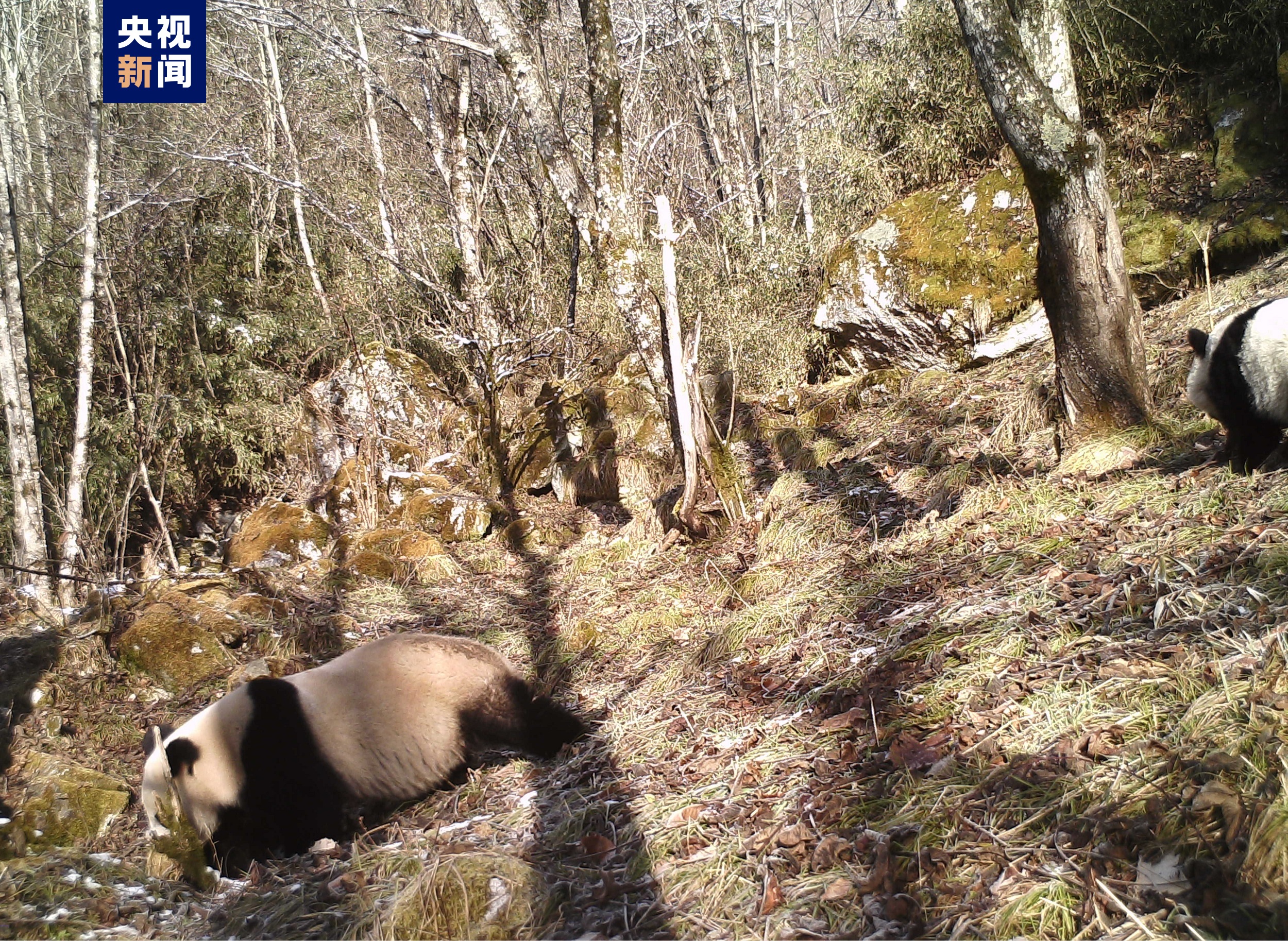 近日,陕西省林业局科研人员在整理红外相机影像资料时,发现布设在太白山自然保护区牛尾河区域的1部红外相机,于2021年12月12日拍摄到2只野生大熊猫一起活动的珍贵照片。根据大熊猫出现的季节、体形、毛色和行为等因素综合判断,这是一对野生大熊猫母子。画面中,大熊猫妈妈走在前面,而熊猫宝宝则在它身后顽皮地抓挠树干。
