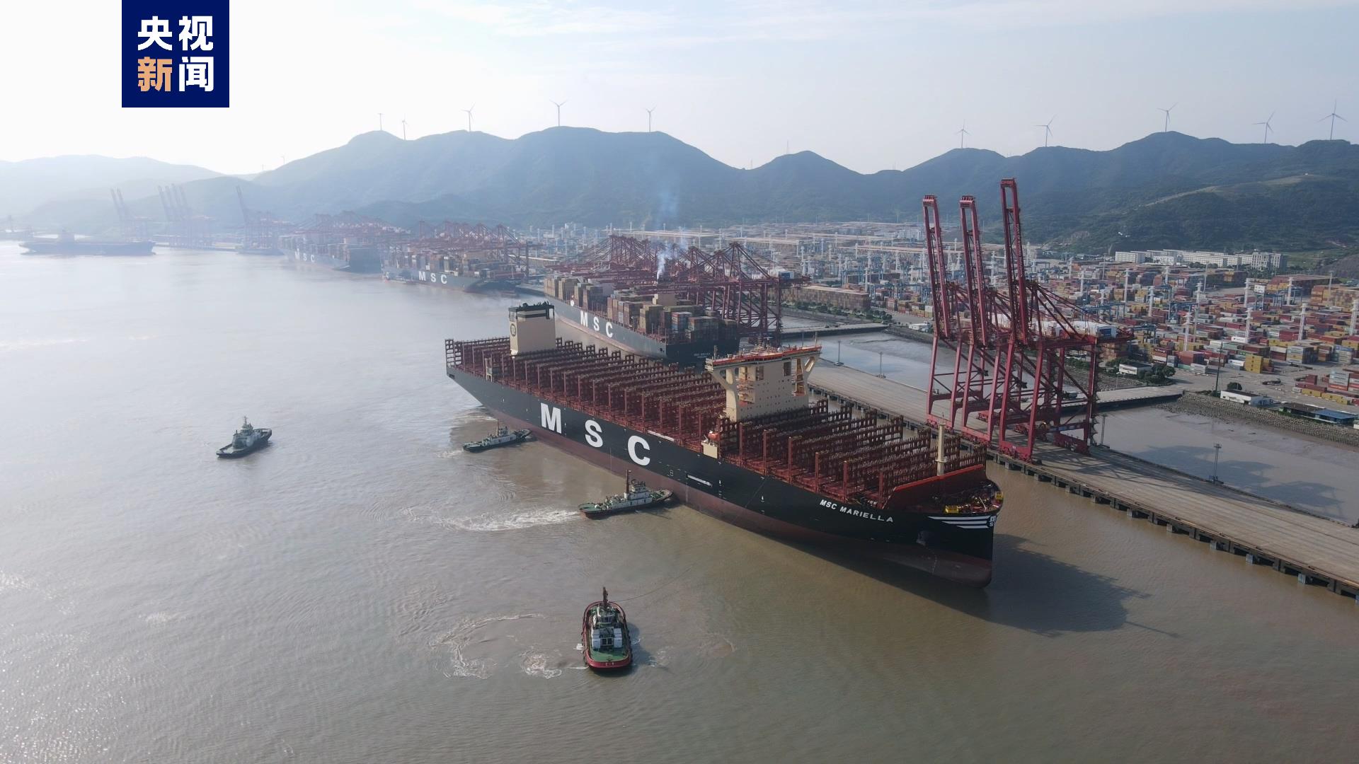 7月12日7时,在4艘拖轮的密切配合下,超大型集装箱船“地中海马里耶拉”轮停靠在宁波舟山港穿山港区集装箱码头4号泊位,完成了该轮正式交付后的首航首靠任务。