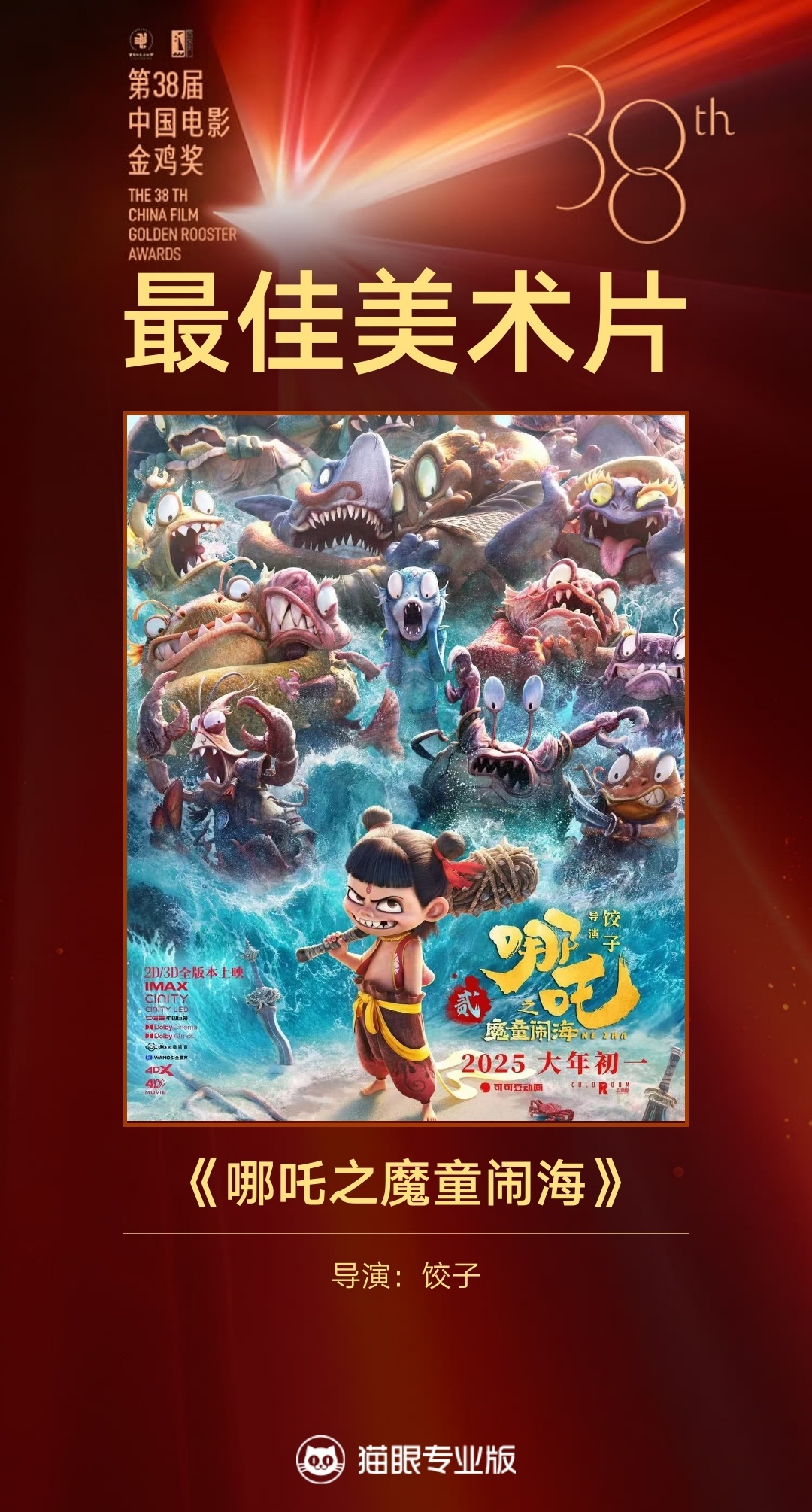 与此同时,由成都可可豆动画影视有限公司制作出品的《哪吒之魔童闹海》 同样不负众望,荣获最佳美术片奖。这部续作影片延续了前作的辉煌,总票房突破159亿元,跻身全球影史票房榜前5。