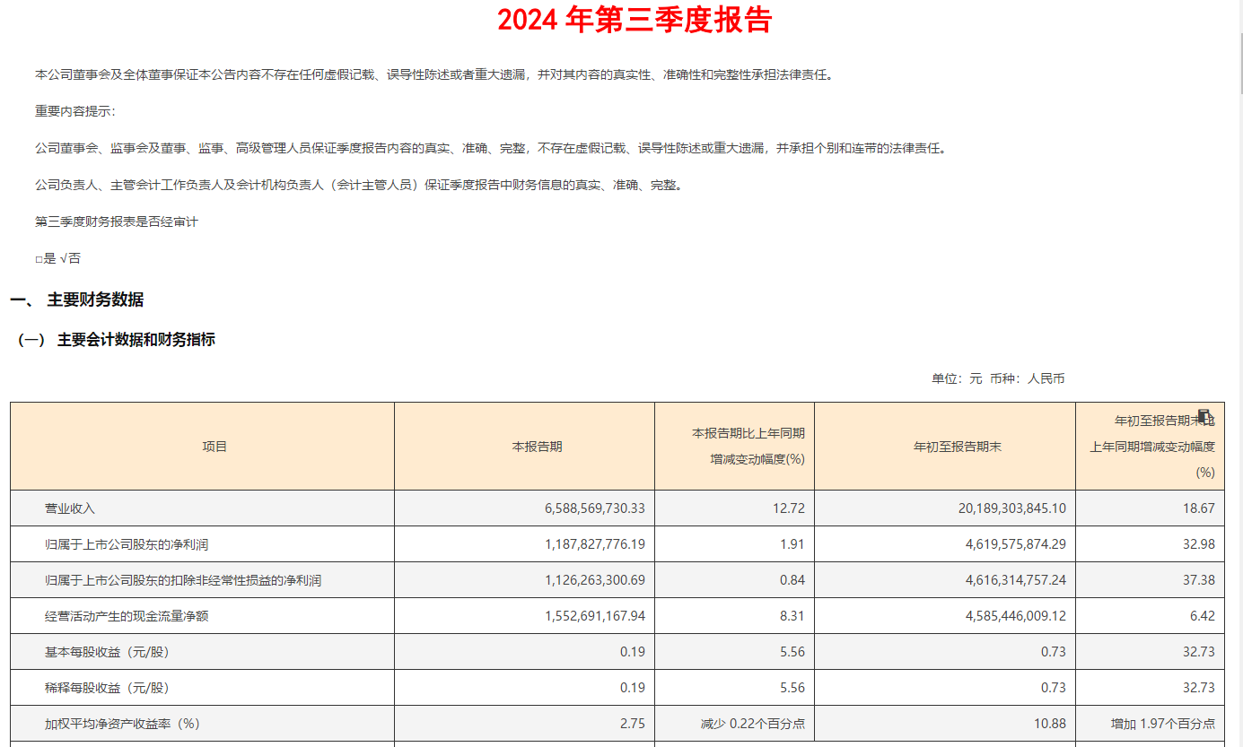 10月24日晚,恒瑞医药公布2024年三季度业绩报告,公司业绩稳健增长:前三季度恒瑞医药实现营业收入201.89亿元,同比增18.67%,归属于上市公司股东的净利润46.20亿元,同比增32.98%,归属于上市公司股东的扣除非经常性损益的净利润46.16亿元,同比增37.38%。