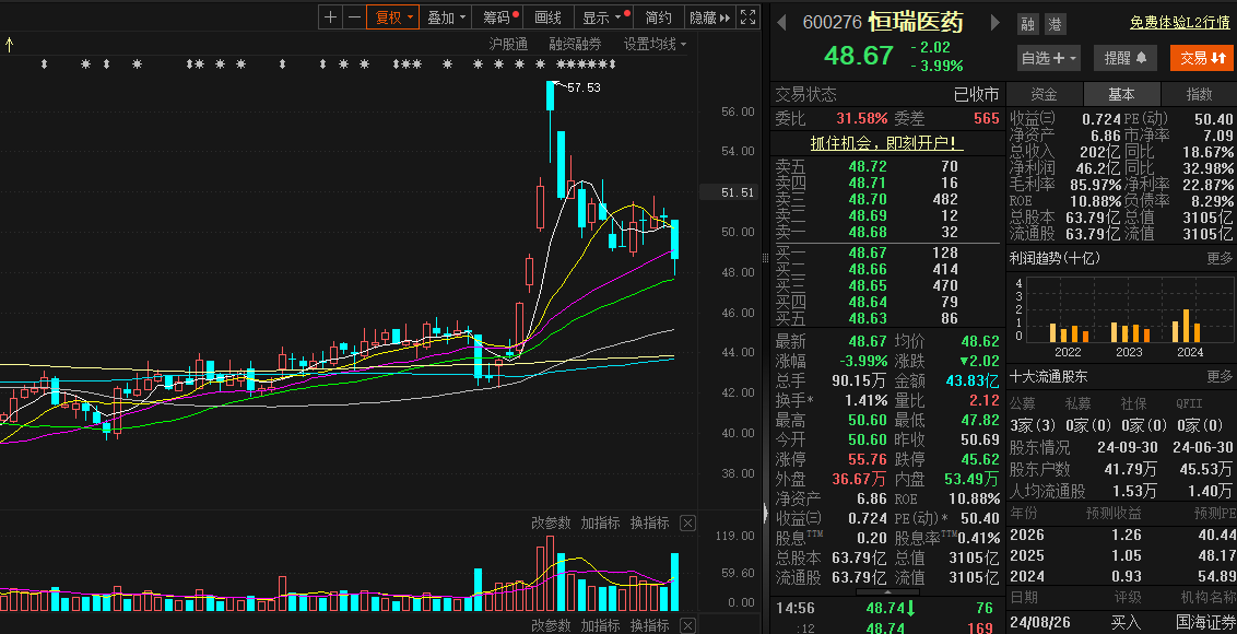 10月24日,恒瑞医药报48.67元每股,报跌3.99%。