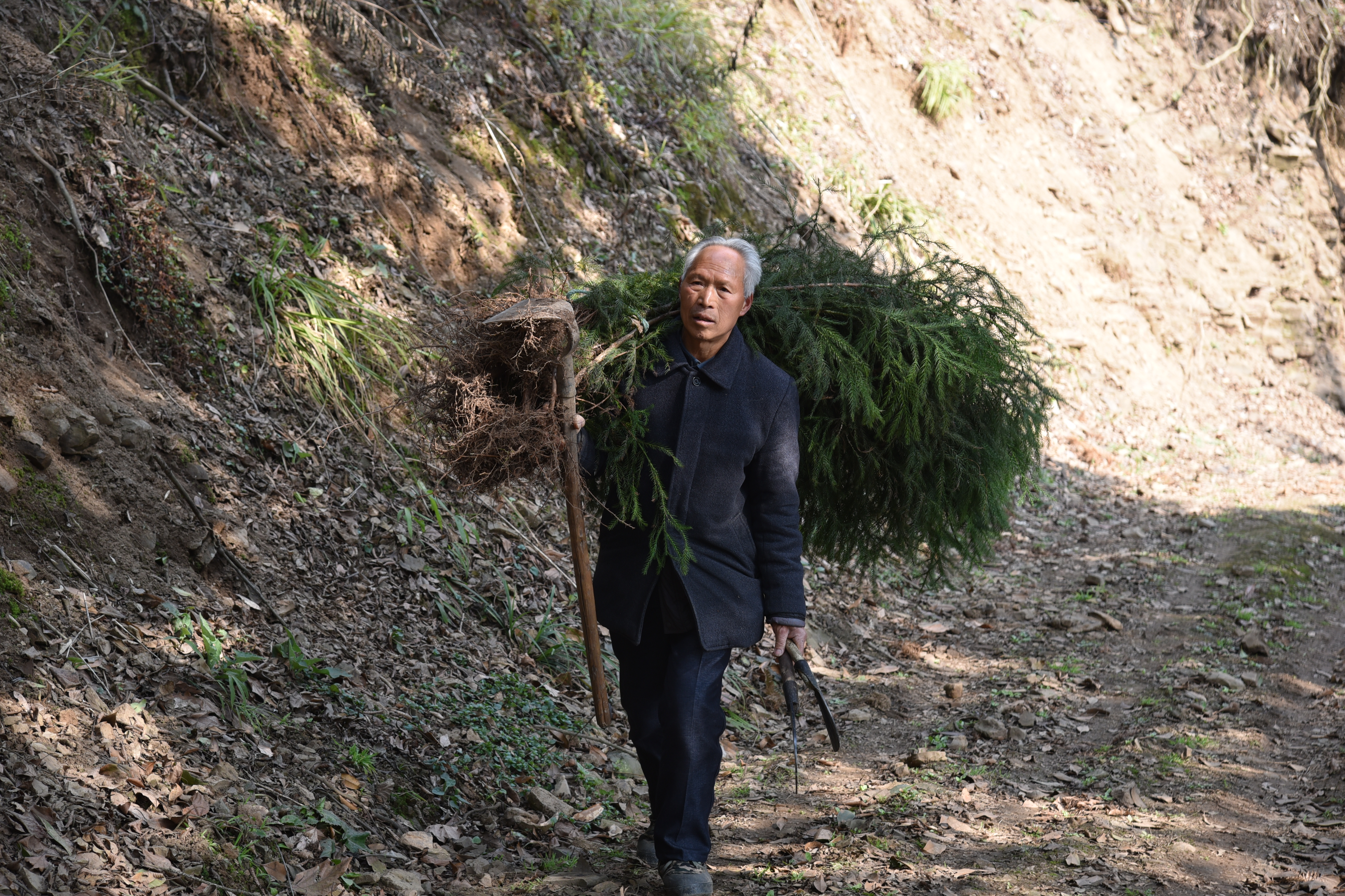 初春,王华文背着树苗上山种树。新华社记者 李凡 摄