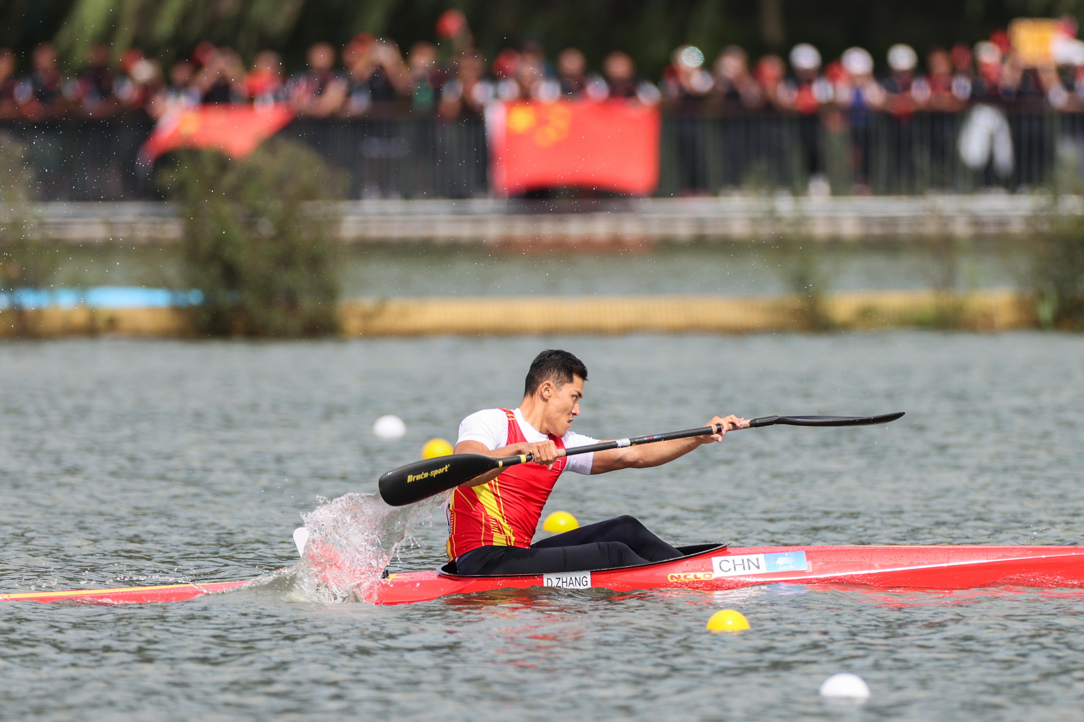 10月2日,张冬在比赛中。当日,杭州亚运会男子1000米单人皮艇决赛在杭州富阳水上运动中心举行,中国选手张冬以3分46秒224的成绩夺冠。新华社记者 单宇琦 摄