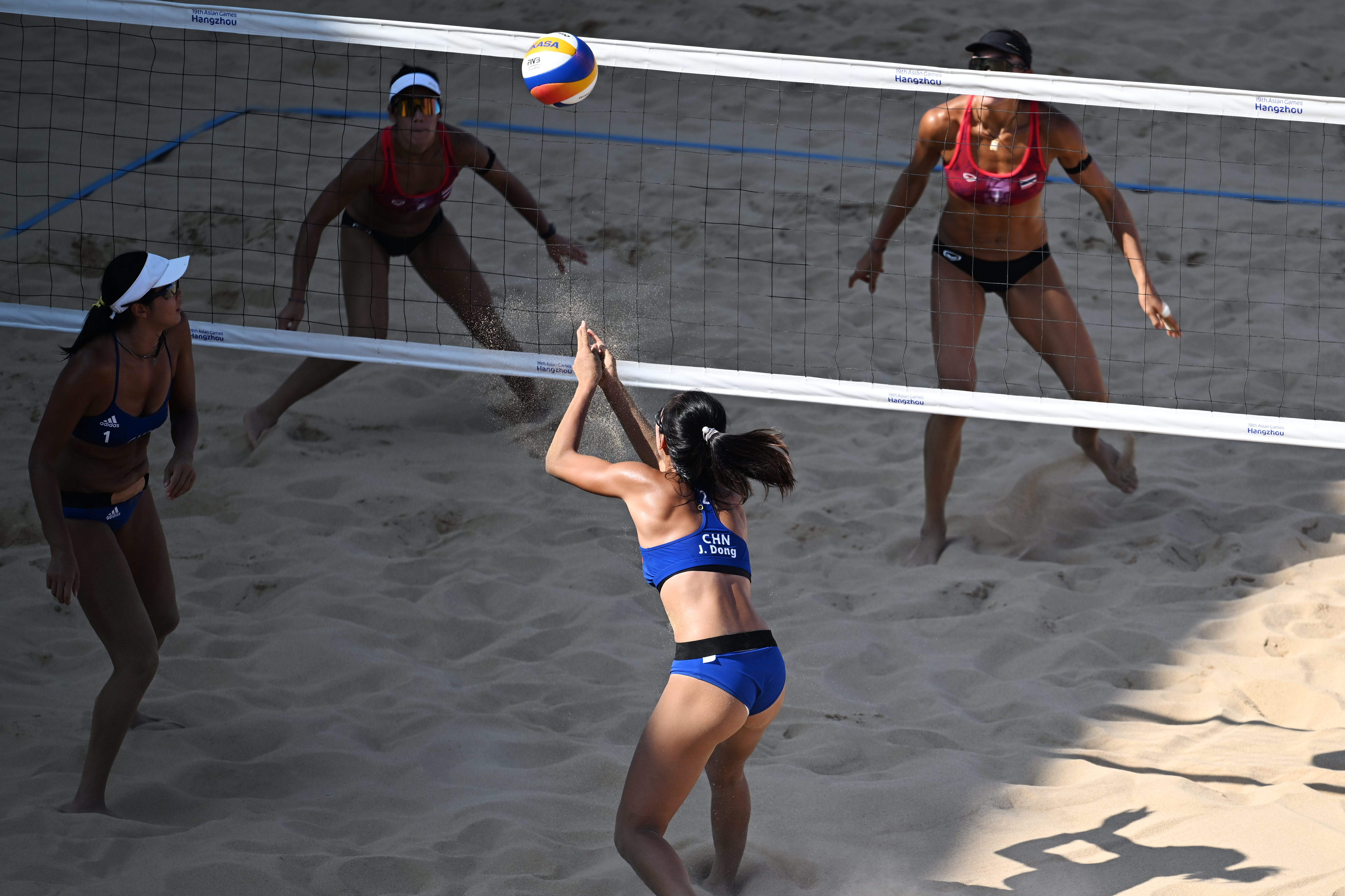 9月27日,在杭州亚运会沙滩排球女子铜牌赛中,中国组合王凡(左)/董颉战胜泰国组合沃拉比拉差亚功·功朴沙鲁达瓦迪/达拉瓦迪·那拉蓬拉巴,获得季军。新华社记者 陈斌 摄