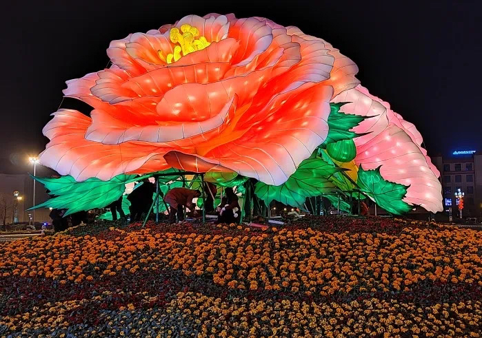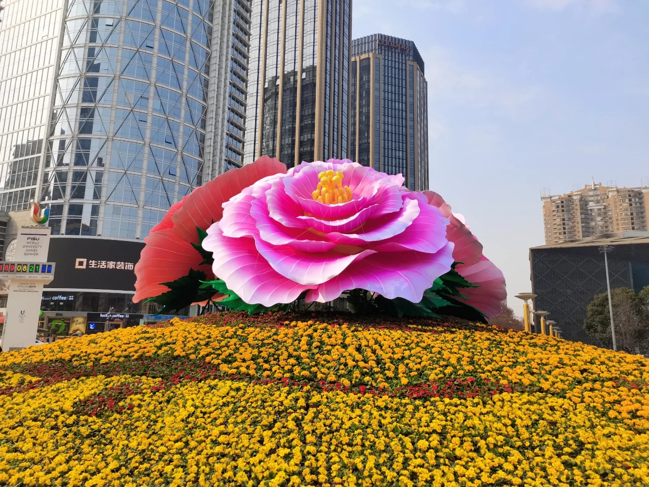 近日,天府广场三朵巨大的芙蓉花雕塑引起不少路人驻足观看。该雕塑名为“花开盛世”,是以成都市花芙蓉、金沙太阳神鸟为元素,采用国家级非物质文化遗产——自贡灯会制作技艺,营造芙蓉花开、欢乐祥和的节日氛围,雕塑直径28米,高度约9米,位于广场中轴线南侧。