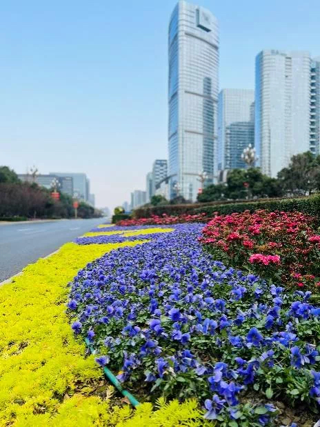 人南立交桥上更换了冬春时节的年宵花卉——仙客来,其花形别致,具有喜迎贵客、平安祥瑞的美好寓意,与黄色三色堇共同营造出喜庆的节日氛围。一环路沿线分散点缀黄色角堇与混色金鱼草,连片的花朵摇曳在风中不惧严寒,让冬日的城市五彩斑斓。
