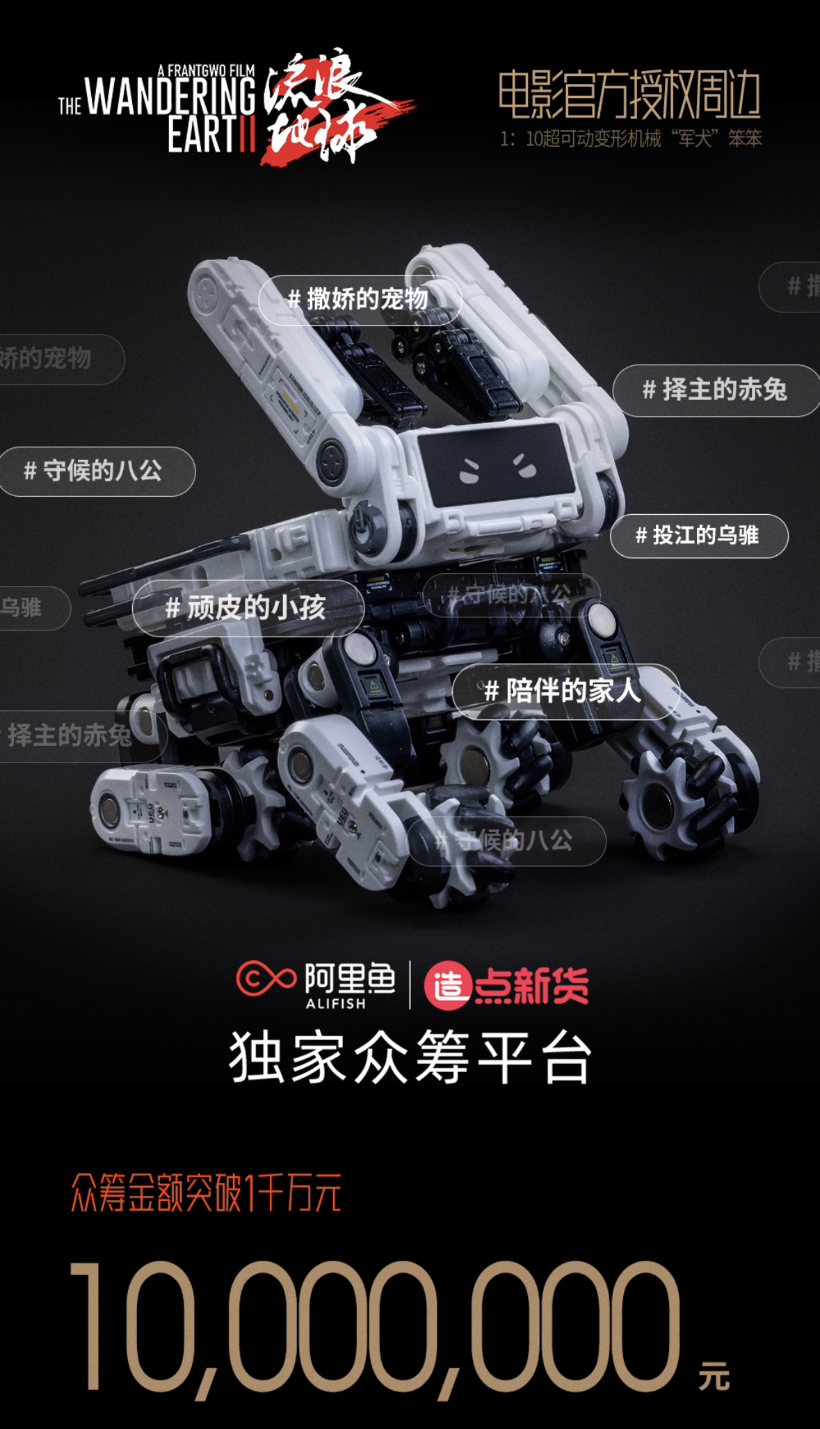 2月7日,据阿里鱼旗下众筹平台造点新货显示,52TOYS推出的《流浪地球2》“笨笨”变形机甲玩具众筹金额已突破1千万元,52TOYS成为《流浪地球2》官方授权衍生品合作方中,第二个众筹金额破千万的品牌。