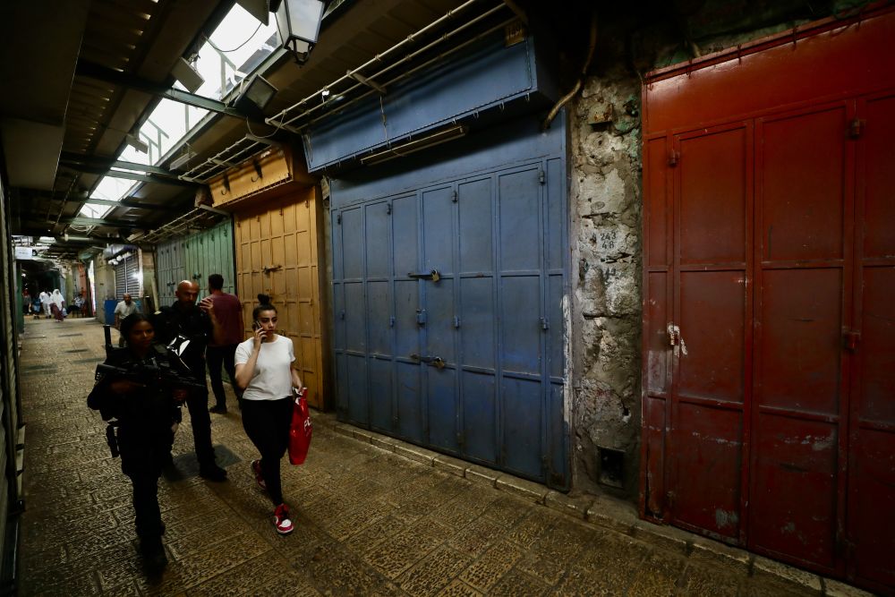 7月31日,在耶路撒冷老城,行人经过关门的店铺。当日,耶路撒冷老城商户举行罢市,抗议哈马斯领导人伊斯梅尔·哈尼亚遇袭身亡。新华社发(贾马尔·阿瓦德摄)