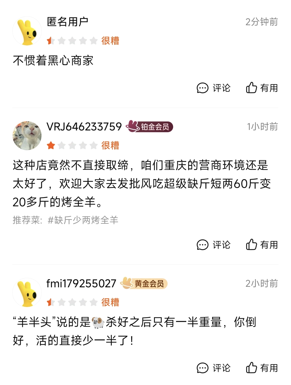 自媒体博主“狂傲探店日常”发布视频称,在渝北区“魔法披风烤全羊”店与巴南区“盘古烤全羊”店消费时,发现两家店均存在严重缺斤少两行为。