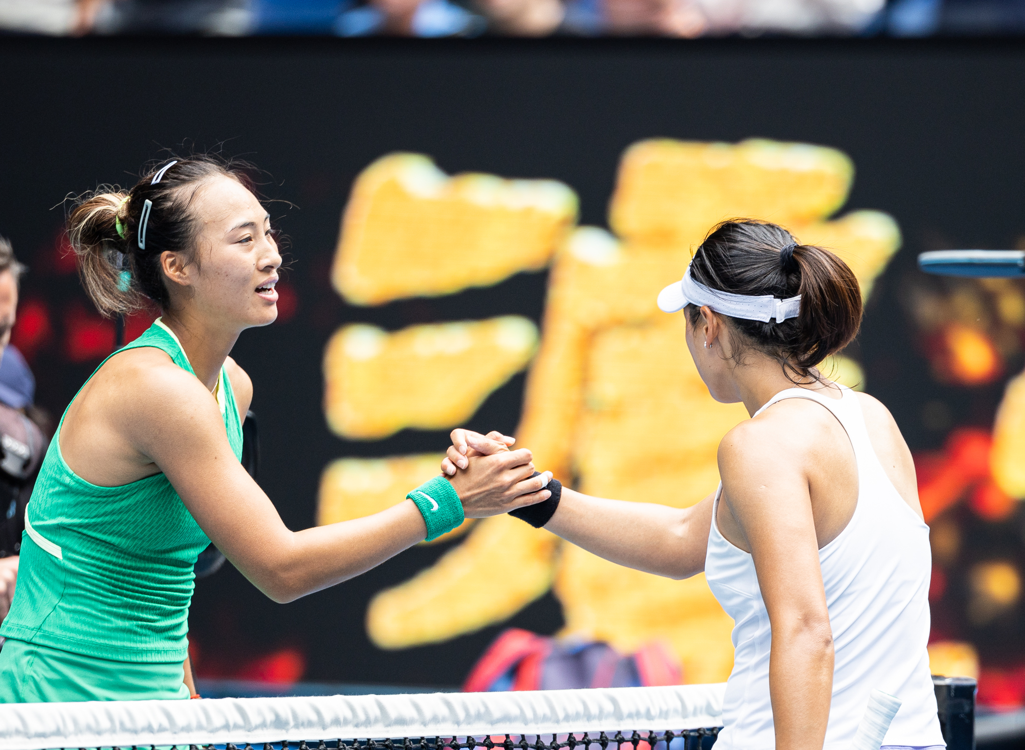 1月20日,郑钦文(左)与王雅繁握手致意。新华社发(胡泾辰 摄)