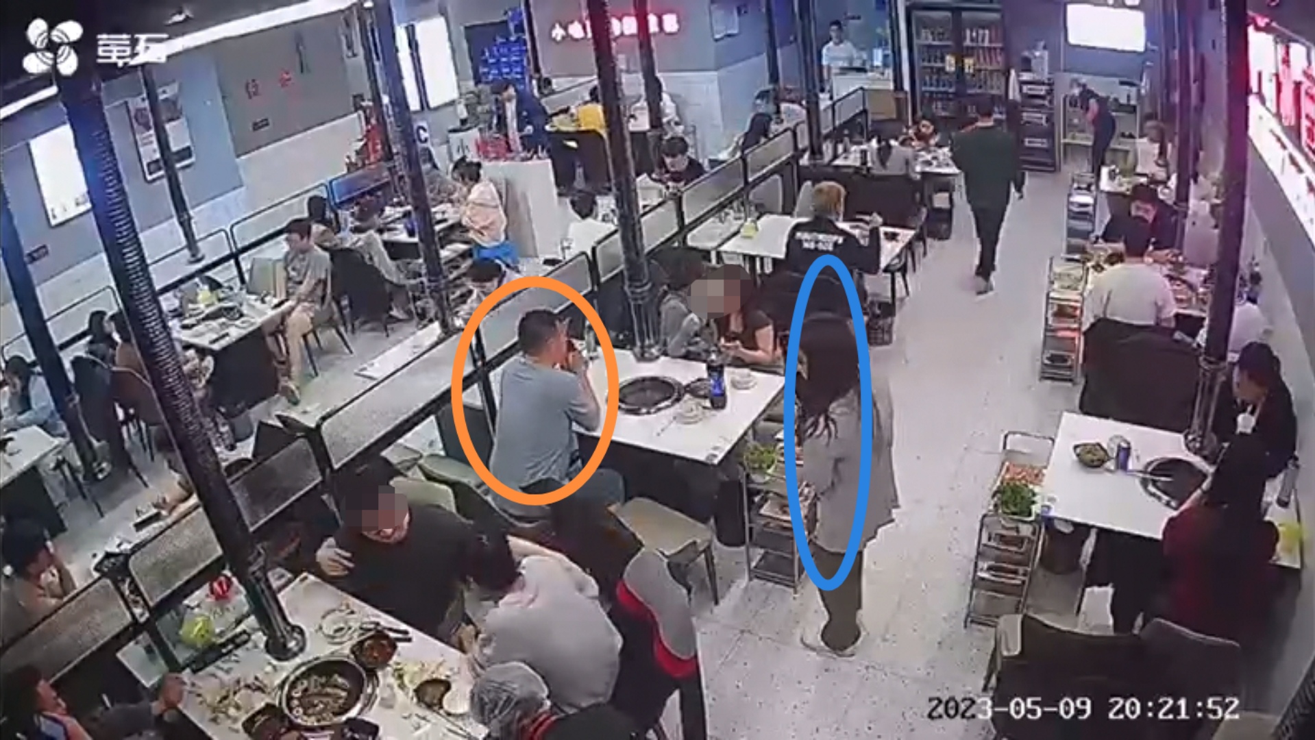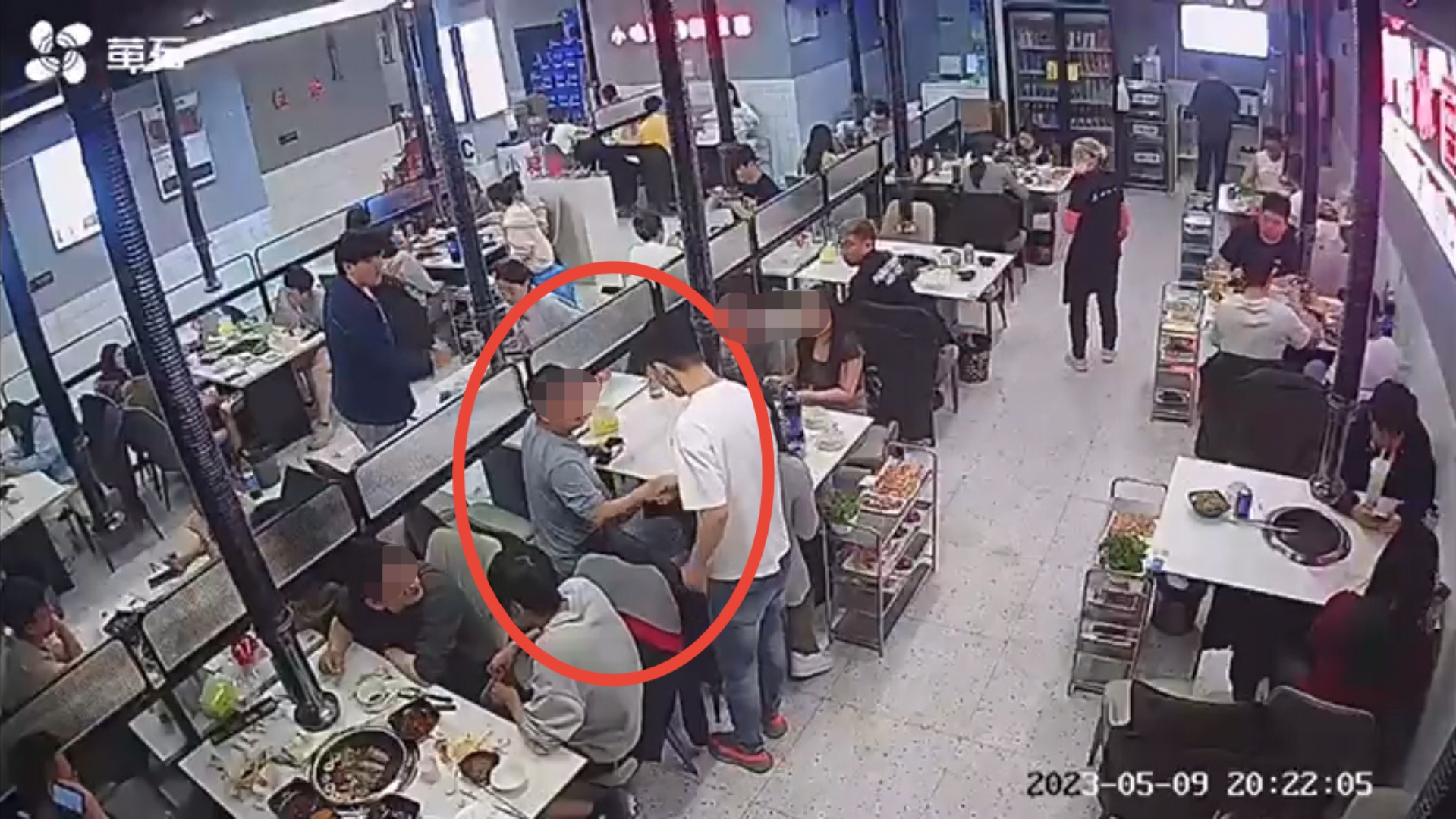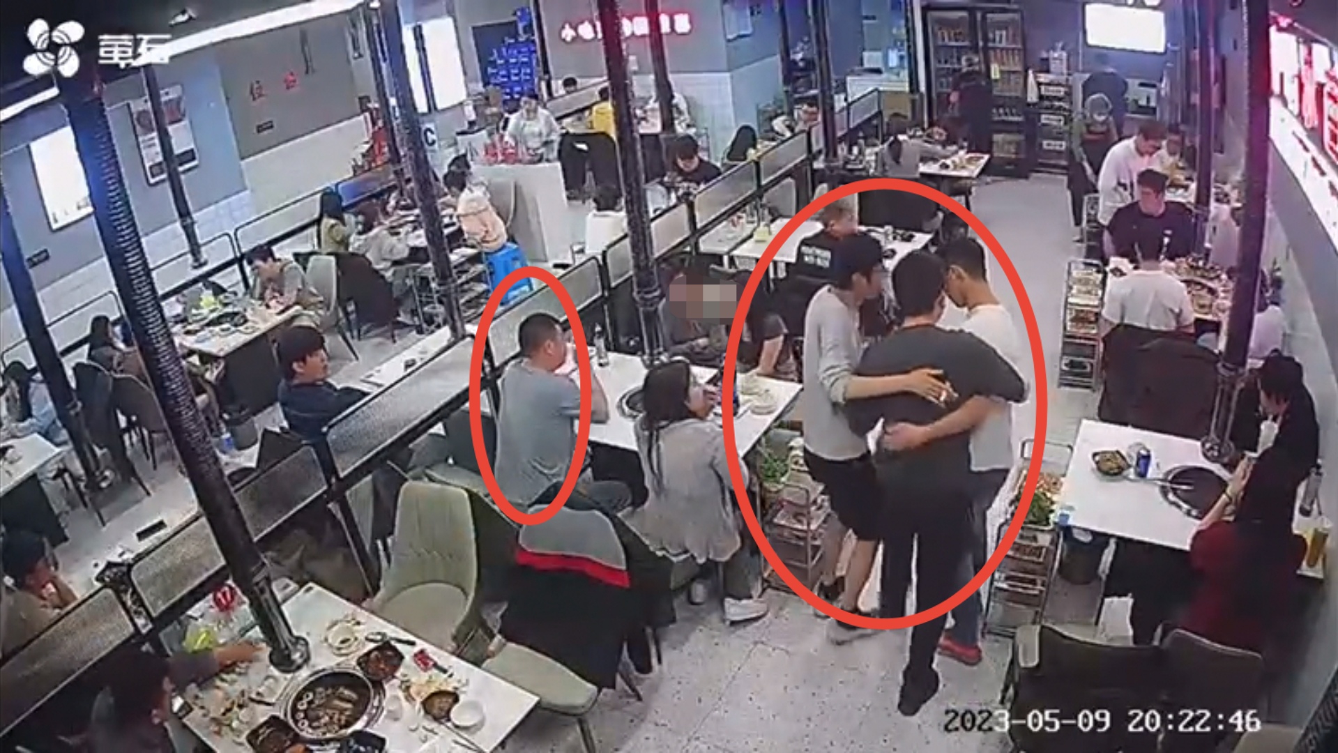 监控视频显示,当晚8点多,4名男子同桌就餐,背后一桌坐着3名女性等待上菜。4名男子相互交谈一番之后,灰衣男子提着杯子起身坐到女生桌前,试图与女生交谈。同时,另一名戴眼镜男子起身,站在灰衣男子身边附身与女生交谈。身体压到女生肩膀后,女生瞬间向外挪动躲开了接触。