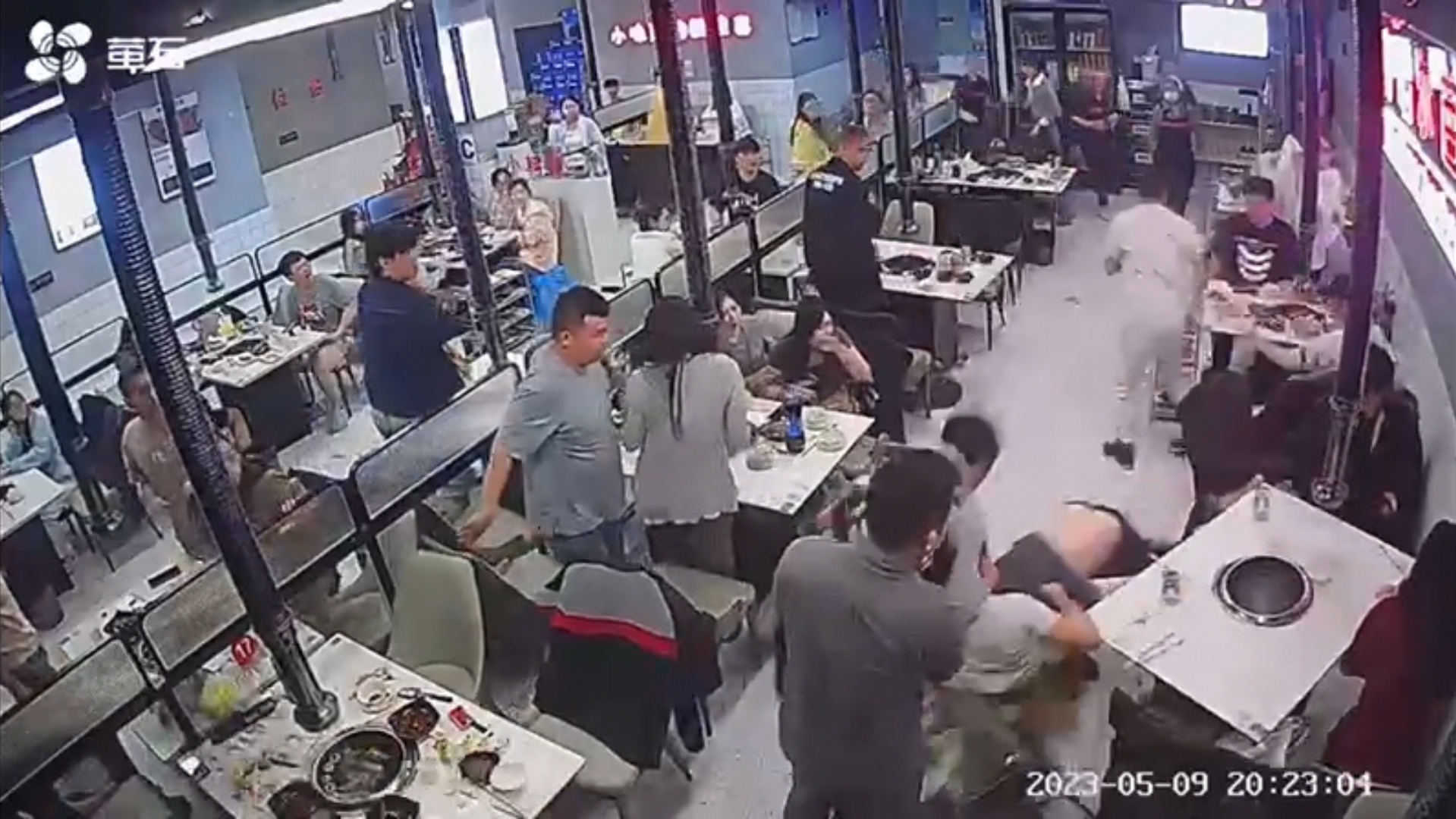 几分钟后,同桌的另一名蓝T恤男子直接走向女生桌子,一名女生立即起身躲避。白衣店员见状上前与蓝T恤男子握手搭话,似乎在劝解什么,上述灰衣男子和戴眼镜男子将其拉住,试图将其推走,口中说“我们出去”。