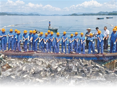 特色养殖 浙江省杭州市千岛湖,捕捞队员合力拉网、喜获丰收。 窦瀚洋 汪 敏摄影报道