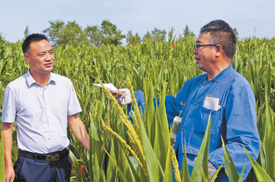 推动玉米制种产业发展壮大 科研助力 甘肃省张掖市甘州区安阳乡的玉米制种试验田内,农业科研人员(右)与当地农民企业家探讨种子的套袋授粉情况。 赵帅杰 赵鸿秀摄影报道