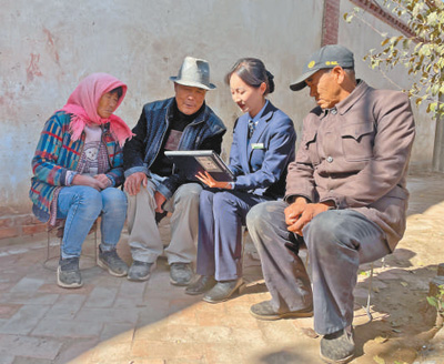 金融支撑 甘肃省张掖市甘州区明永镇上崖村,张掖农商银行工作人员在指导玉米制种农户进行线上申请贷款业务。 冯 杰摄(人民视觉)
