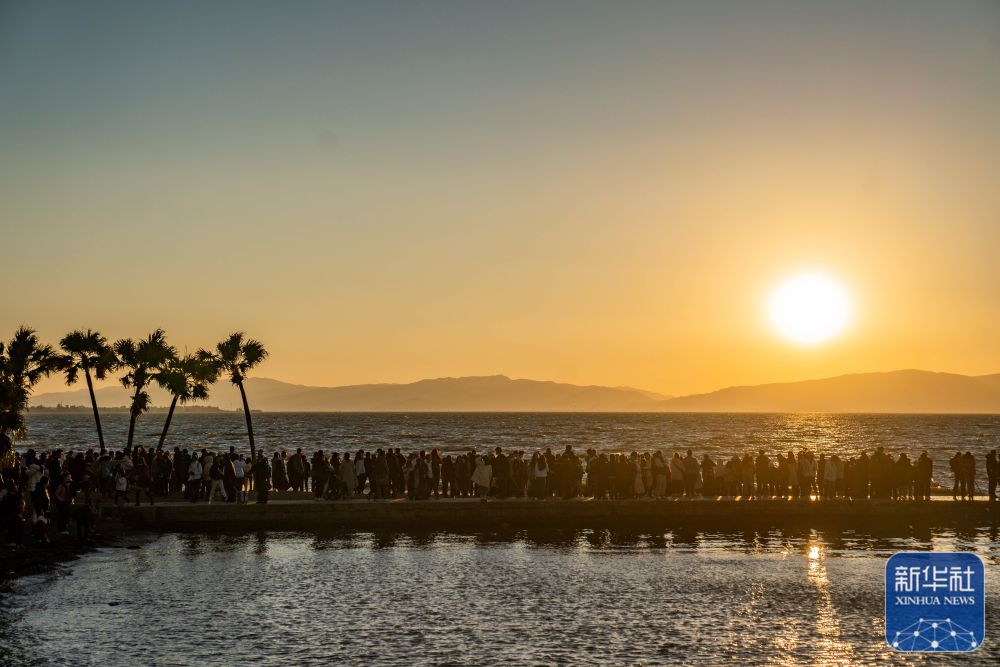 1月22日,游客在云南省昆明市观赏滇池日落。新华社记者 胡超 摄
