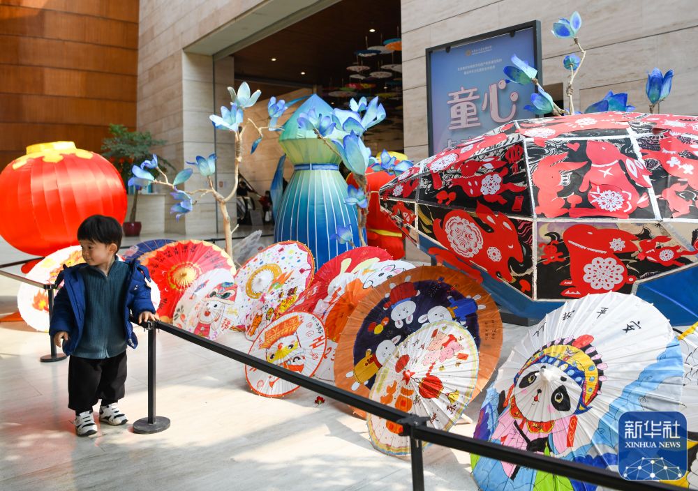 1月24日,在四川成都的金沙遗址博物馆,小朋友在“童心点亮金沙”校园非遗成果展前留影。新华社记者 王曦 摄