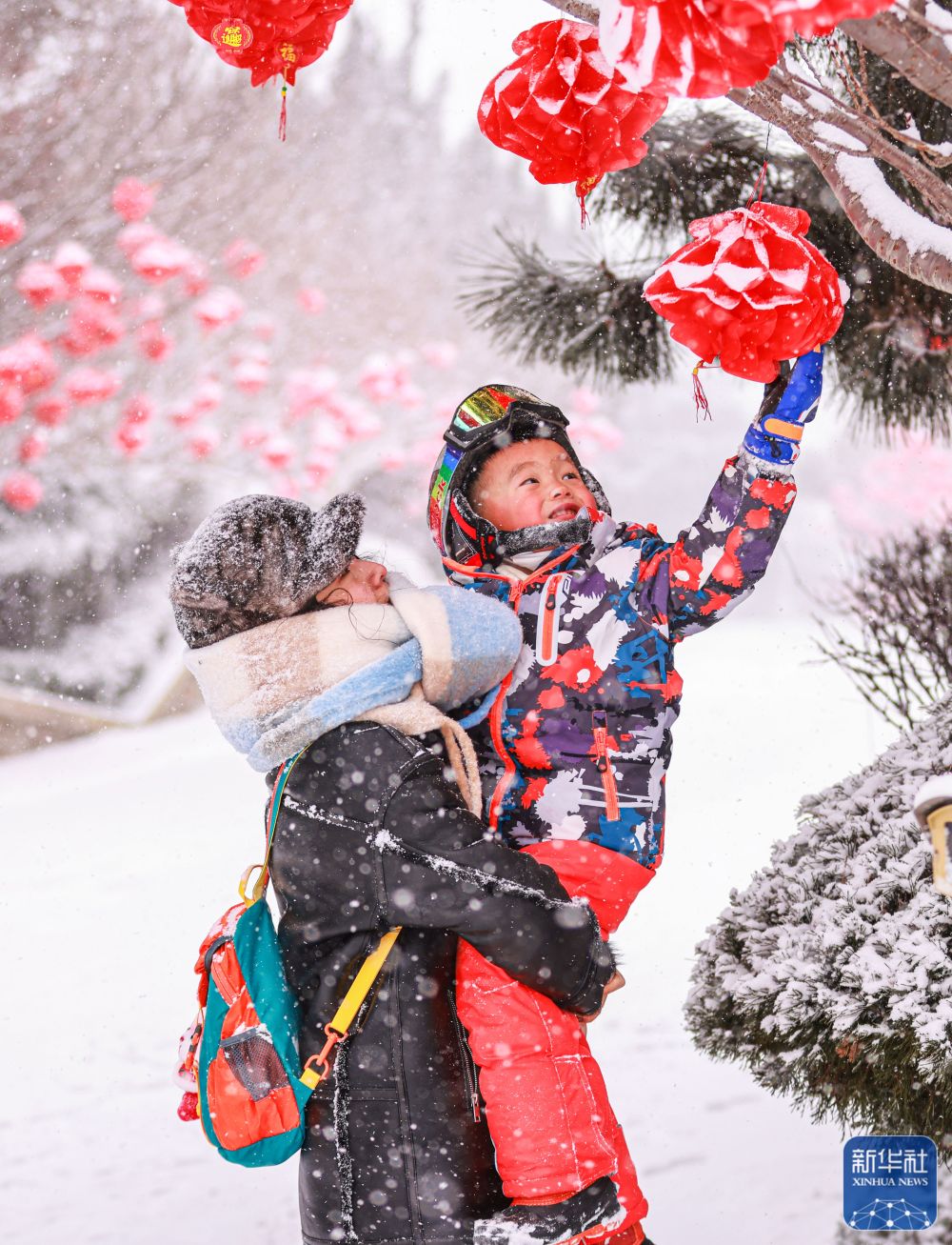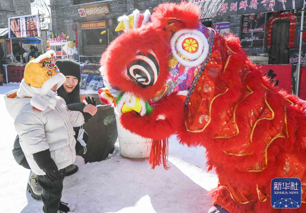 1月24日,在位于河北省遵化市的唐山尚禾源旅游景区,舞狮演员与一名小游客互动。新华社发(刘满仓摄)