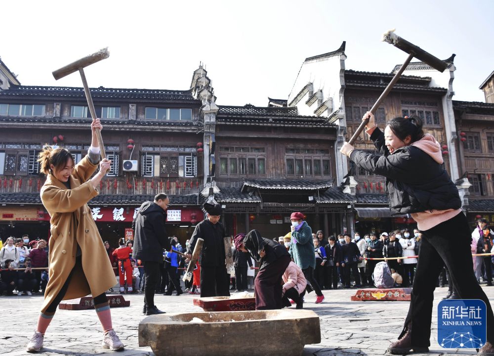1月24日,游客在贵州省黔东南苗族侗族自治州凯里市下司古镇体验打糍粑。新华社发(余天英摄)