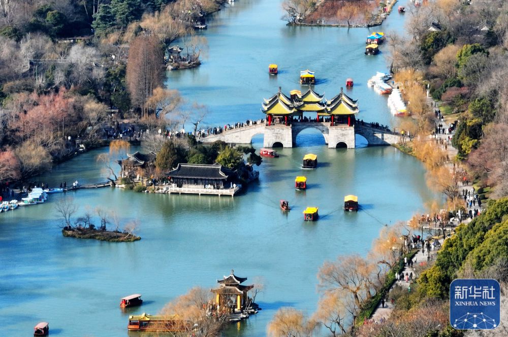 1月24日,游客在江苏扬州瘦西湖风景区游览(无人机照片)。新华社发(孟德龙摄)