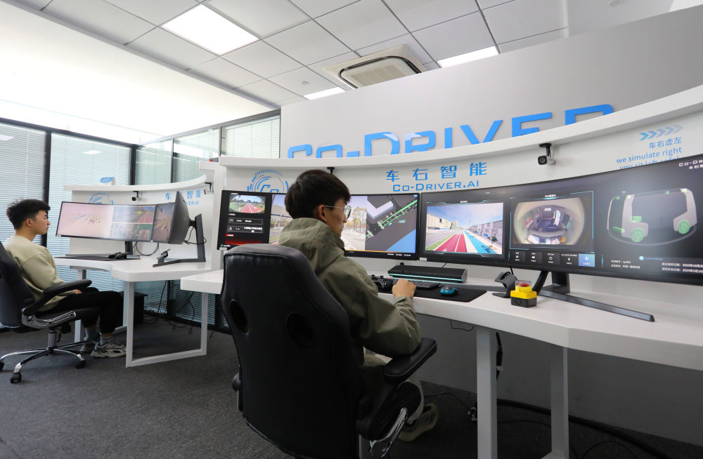 在位于中国(上海)自由贸易试验区临港新片区的一家智能驾驶企业,工作人员通过无人驾驶汽车远程监管平台的实时画面,结合电子地图对在自动驾驶测试专用路上行驶的车辆进行监管(2024年4月9日摄)。