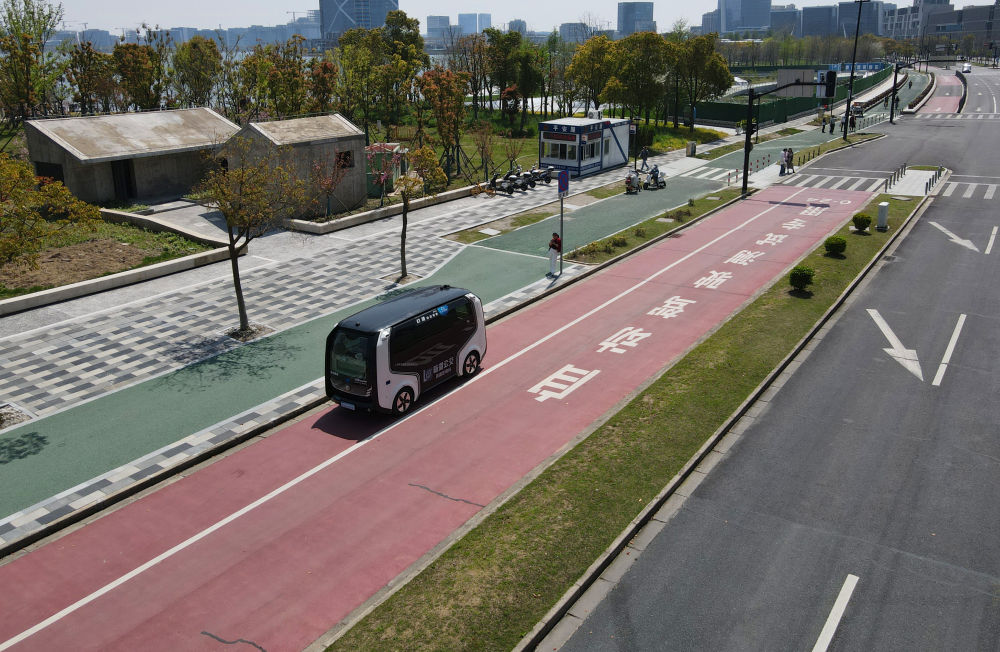 在中国(上海)自由贸易试验区临港新片区,一辆无人驾驶汽车行驶在自动驾驶测试专用路上(无人机照片,2024年4月9日摄)。