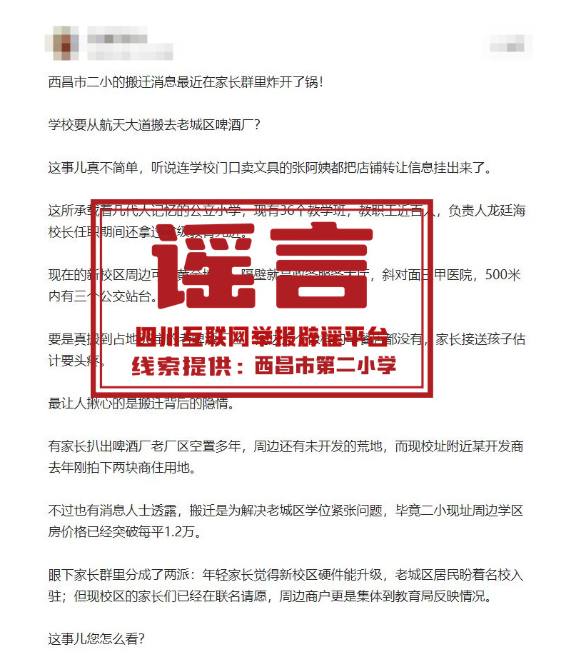 近日,有网民在今日头条平台发布帖文称“西昌市二小将要从航天大道搬迁至老城区啤酒厂,相关信息在家长群炸开了锅”等内容。