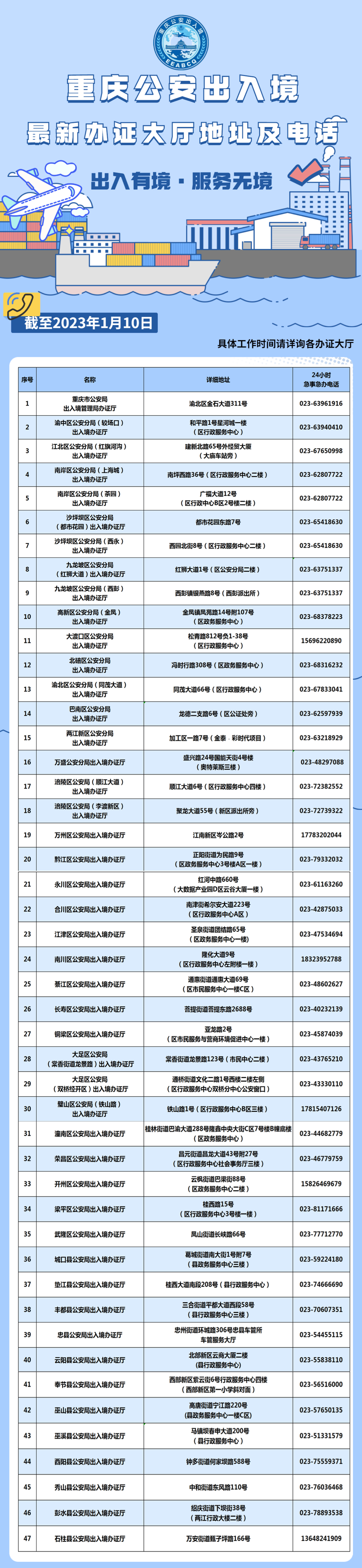 出入境管理局已在“重庆公安出入境”微信公众号更新了每个出入境办证大厅的详细地址、办证时间、咨询电话、24小时急事急办电话等,方便市民就近办理。