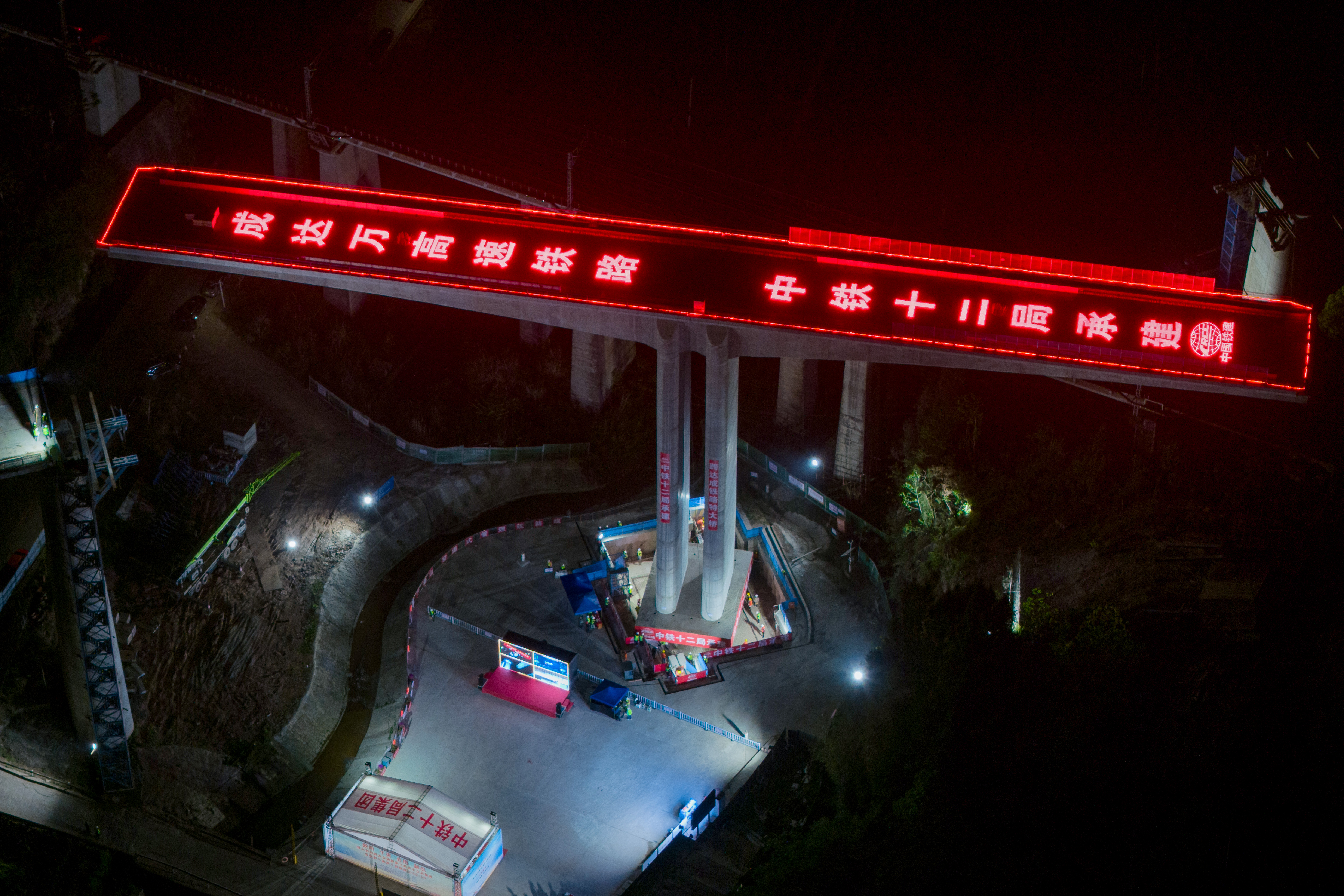 4月16日凌晨,经过115分钟的紧张施工,在建中的成达万高铁大通镇跨达成铁路特大桥连续梁逆时针旋转44度,完成上跨达成铁路施工,这也是全线首座完成转体的连续梁。