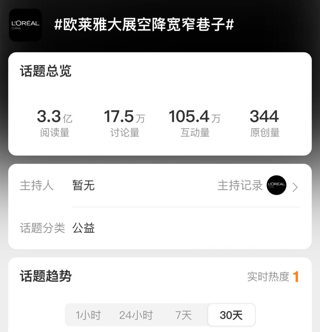 “美·万象人间”艺术展开幕后,迅速成为全网爆点,各大社交平台更是掀起了一股观展热潮,“值得一刷”“打卡好去处”“很有艺术感”“超级出片”……各种打卡帖接踵而至。值得注意的是整个展览期间,#欧莱雅大展空降宽窄巷子#的话题在社交平台上吸引了超过3亿人次关注,引起了160多万人发起讨论,引发强烈反响。