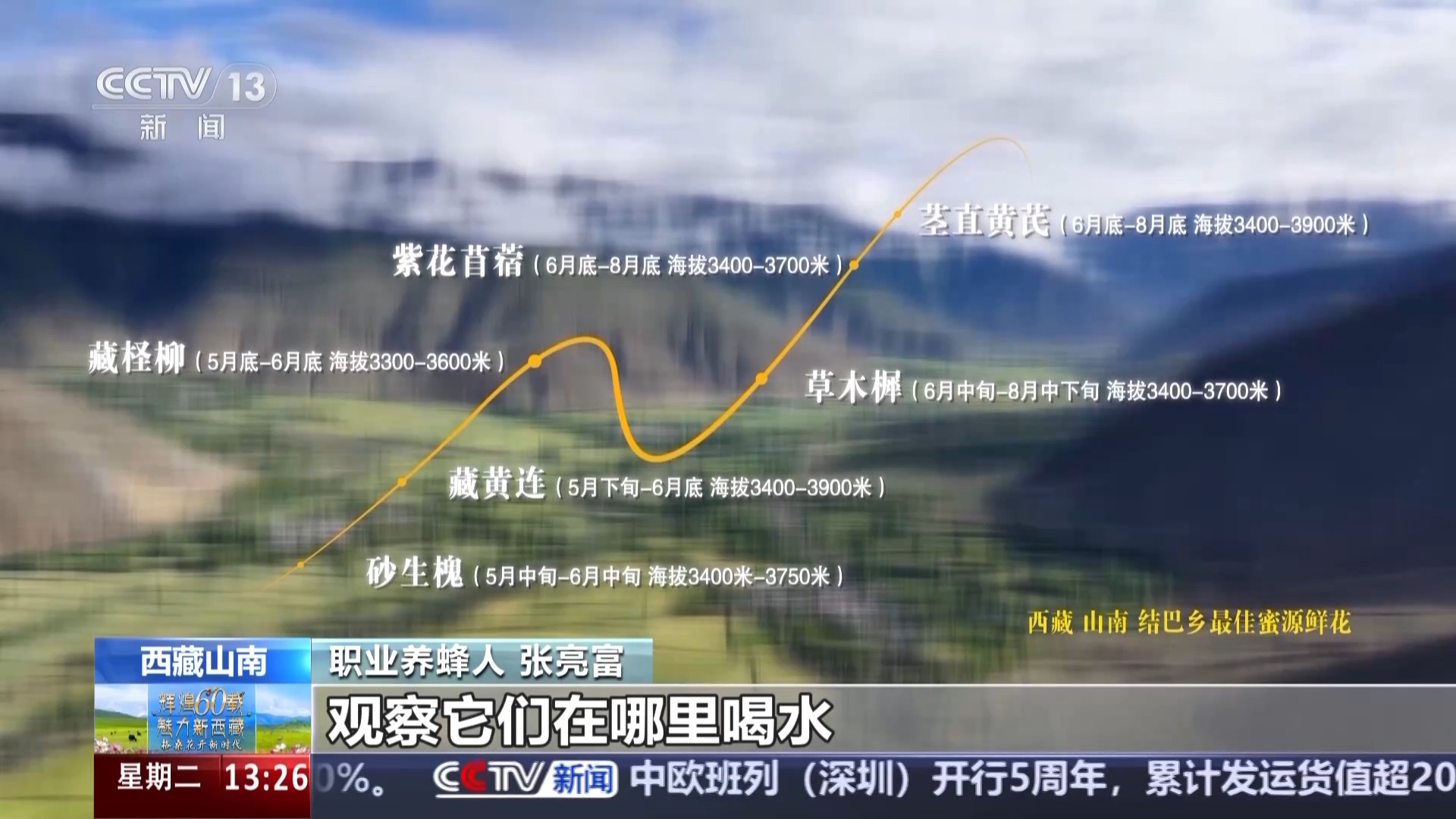职业养蜂人 张亮富:把蜜蜂在最合适的时间,放到最合适的位置,我们就可以采到最珍贵的蜂蜜了。所以我就用这种最笨的办法,去制作我们区域的鲜花地图。观察它们在哪里喝水,去哪里采蜜,采什么花的蜜。采蜜地图成形后,二十箱蜜蜂有了各自的“家”。
