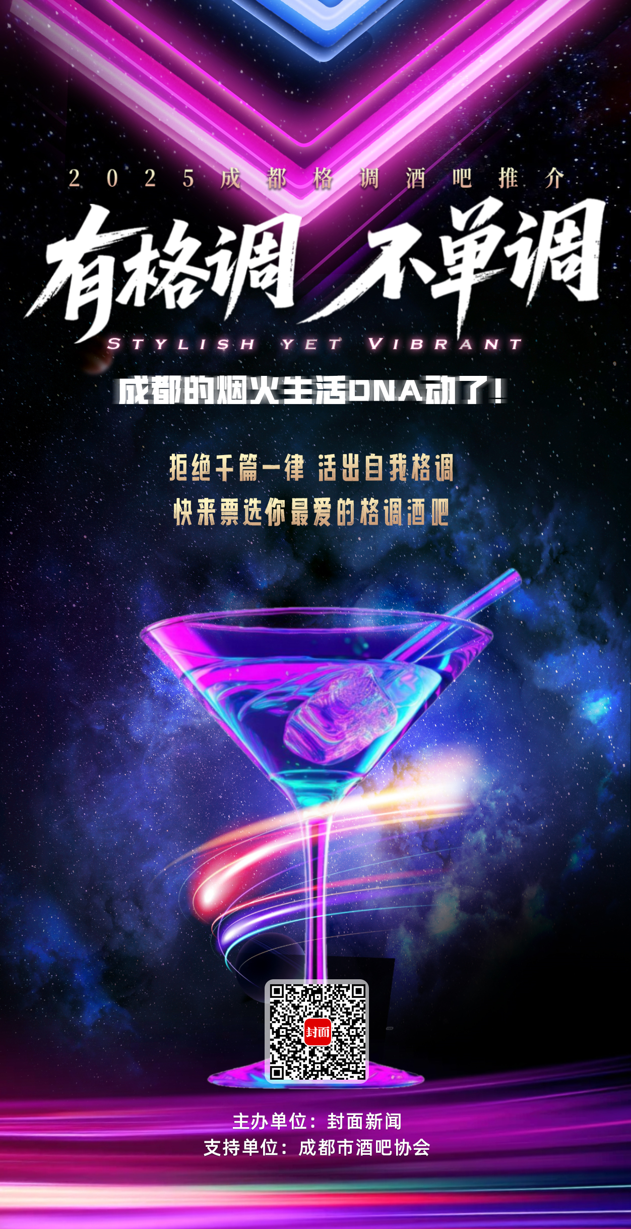 扫描海报二维码,通过封面新闻APP,参与2025成都格调酒吧推介人气榜。