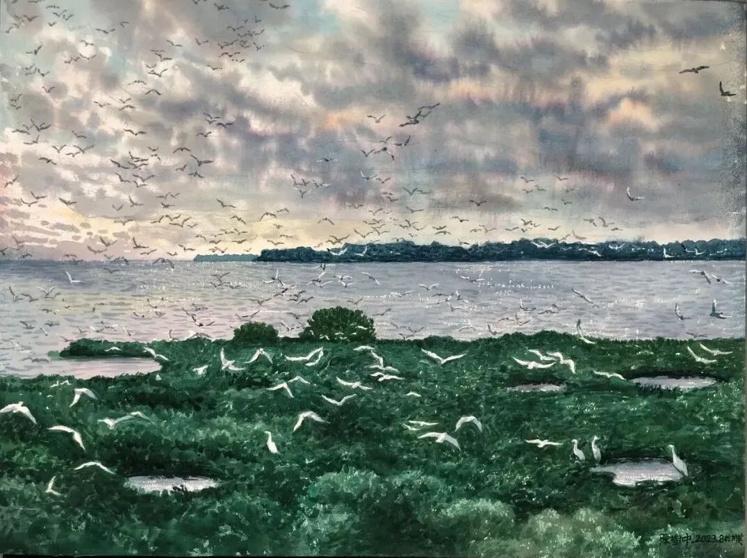 水彩画《湛江红树林湿地风光》,作者陈树中。“十四五”时期,广东湛江聚力打造“红树林之城”。如今,湛江红树林湿地不仅是净化海洋的“海上森林”,更是鸟的天堂、生物多样性宝库,被誉为“世界湿地生态恢复成功范例”。作品以此为着眼点,通过水天一色的空间布局和细腻的光影刻画,描绘了一幅壮阔优美的生态画卷。郁郁葱葱的红树林与波光粼粼的海面相辉映,在霞光中翩跹起舞的成群鹭鸟,不仅展现了生命的律动,更是对人与自然和谐共生理念的生动诠释。
