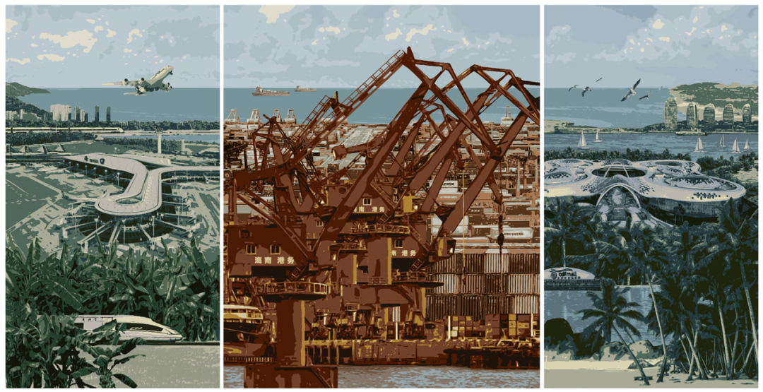 版画《海南自贸港》,作者孔国桥、鲁利锋、王克景。南海之滨,改革潮涌。5年来,海南自贸港加速建设发展,步入成形起势新阶段。作品以绝版套色木刻和三联画形式,刻画了自贸港宏阔的场景,通过冷暖色彩的运用着意突出机场、港口、基建等主体,在跨时空描绘中多角度展现海南自贸港繁荣的景象和蓬勃的活力,奏响开放发展的时代乐章。