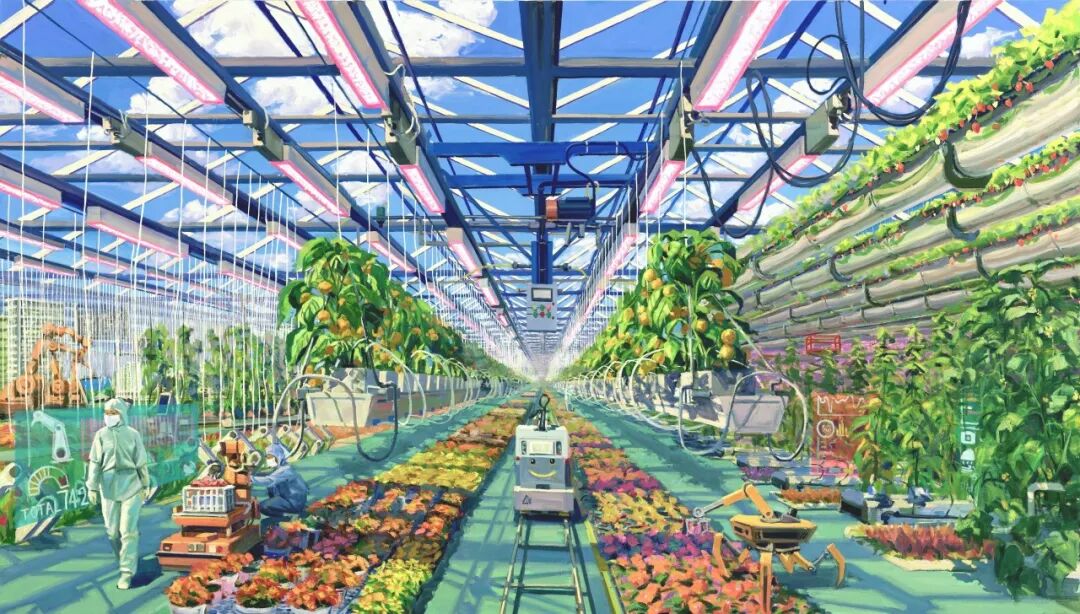 油画《智能农业园》,作者袁元、张子欣。在科技驱动下,智慧农业发展迈上新台阶。作品聚焦智能温室农业生产场景,重在表现物联网监控系统等对传统农业的改造。画面以写实的笔触、开阔的构图和明亮的色彩,营造出满满的科技感;现代设施的几何化结构与农作物的自然曲线相映成趣,工业美学与田园诗意融为一体,铺展田园牧歌新画卷。