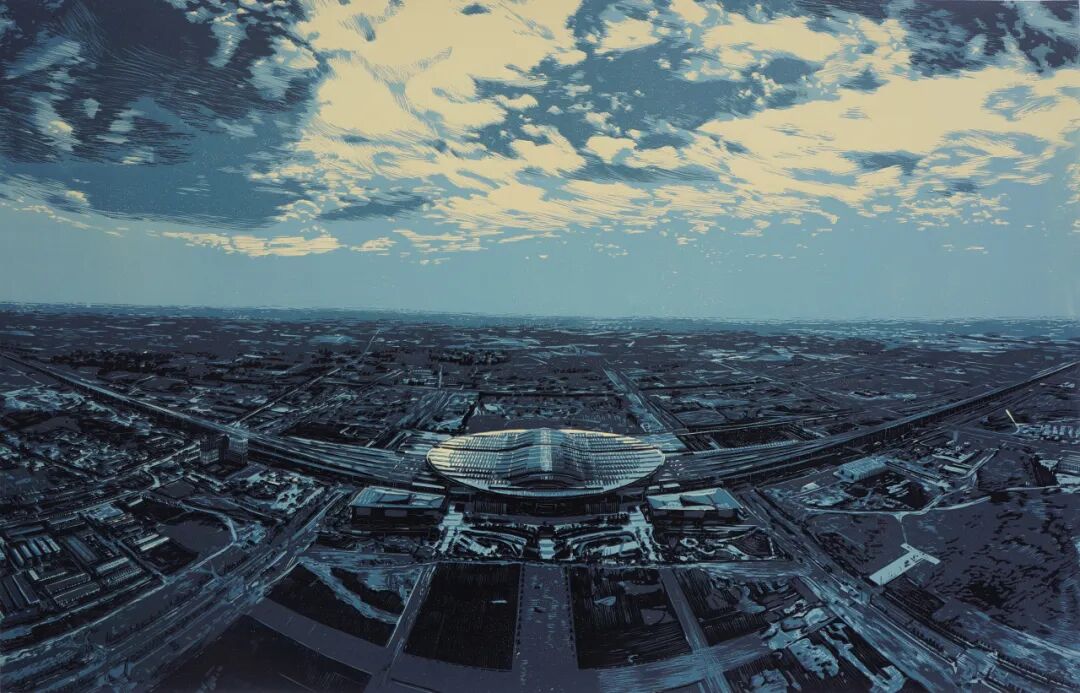版画《雄安的黎明》,作者王芳。从“一块地”到“一张图”再到“一座城”,八载光阴,河北雄安新区拔节生长、日新月异。作品以俯瞰式构图,展开一幅壮阔图景。画面上,写实的雄安站巍然屹立,位于视觉中心;四通八达的路网和各功能区交织,配以沉稳的色彩和光线的巧妙运用,彰显这座城市璀璨的未来。