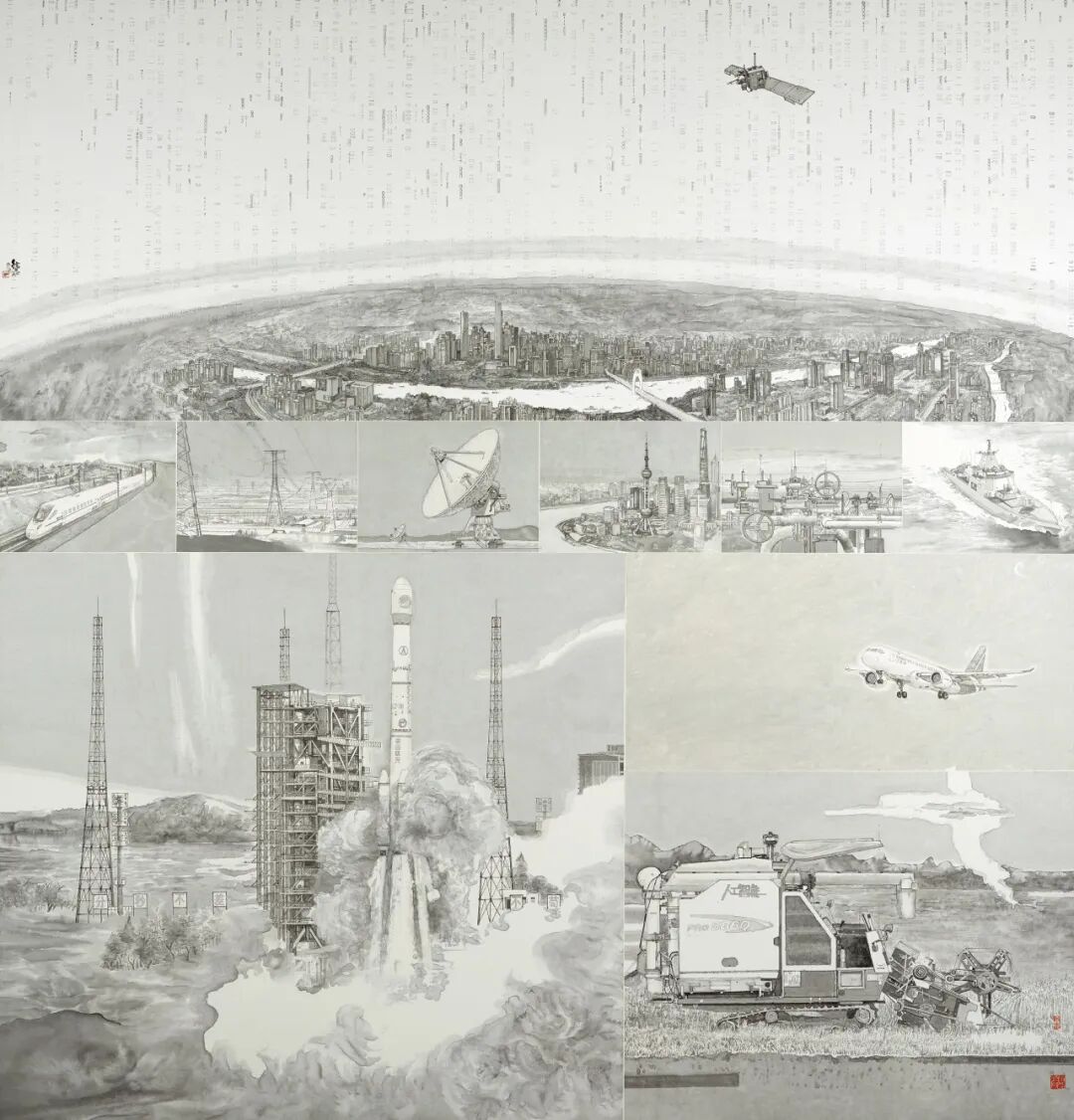 中国画《国之重器·北斗》,作者宋德志。作者通过精心重组主题元素,使海陆空景象巧妙交织,呈现了北斗在能源交通、农业生产、城市建设等领域的广泛运用,生动诠释北斗应用不断深度融入国民经济发展全局。素雅的笔墨处理赋予画面轻灵之美,意在表达北斗卫星导航系统那种看不见的支撑力量。