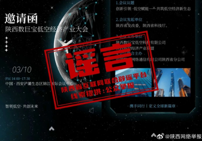 近日,针对网络上流传的关于“陕西数巨宝低空经济产业大会”的不实信息,经与陕西省科学技术厅核实,该活动系冒用其名义进行的虚假宣传,提醒各单位及广大企业提高警惕,切勿上当受骗。